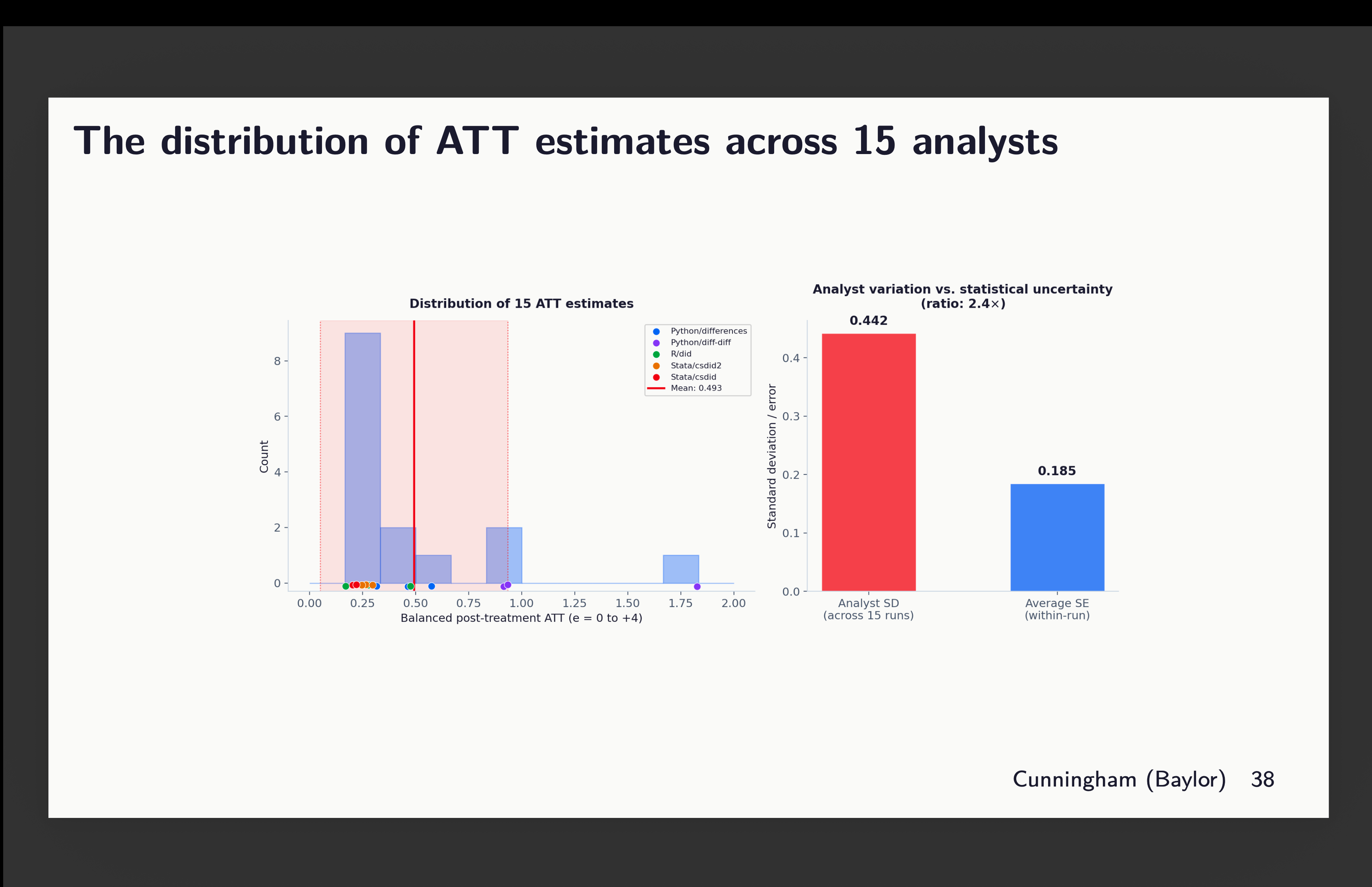 Final week I had Claude implement a “multi-analyst design” throughout 5 Callaway and Sant’Anna packages (2 in python, 1 in R, 2 in Stata) on a hard and fast dataset, a common baseline, ~20 covariates to select from for satisfying conditional parallel tendencies, and the identical goal parameter. You’ll find that right here: