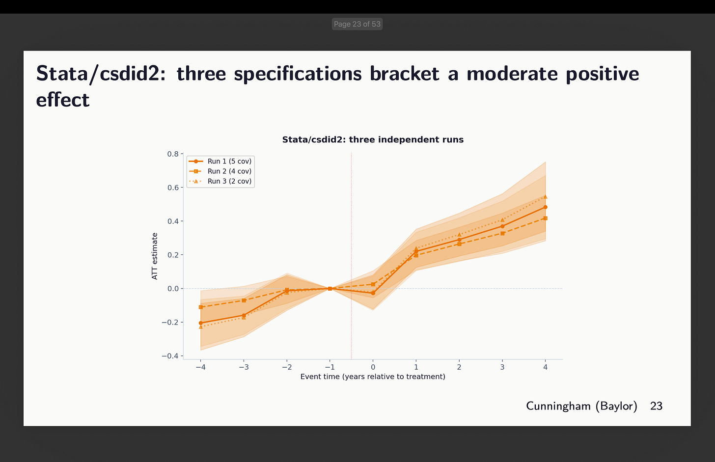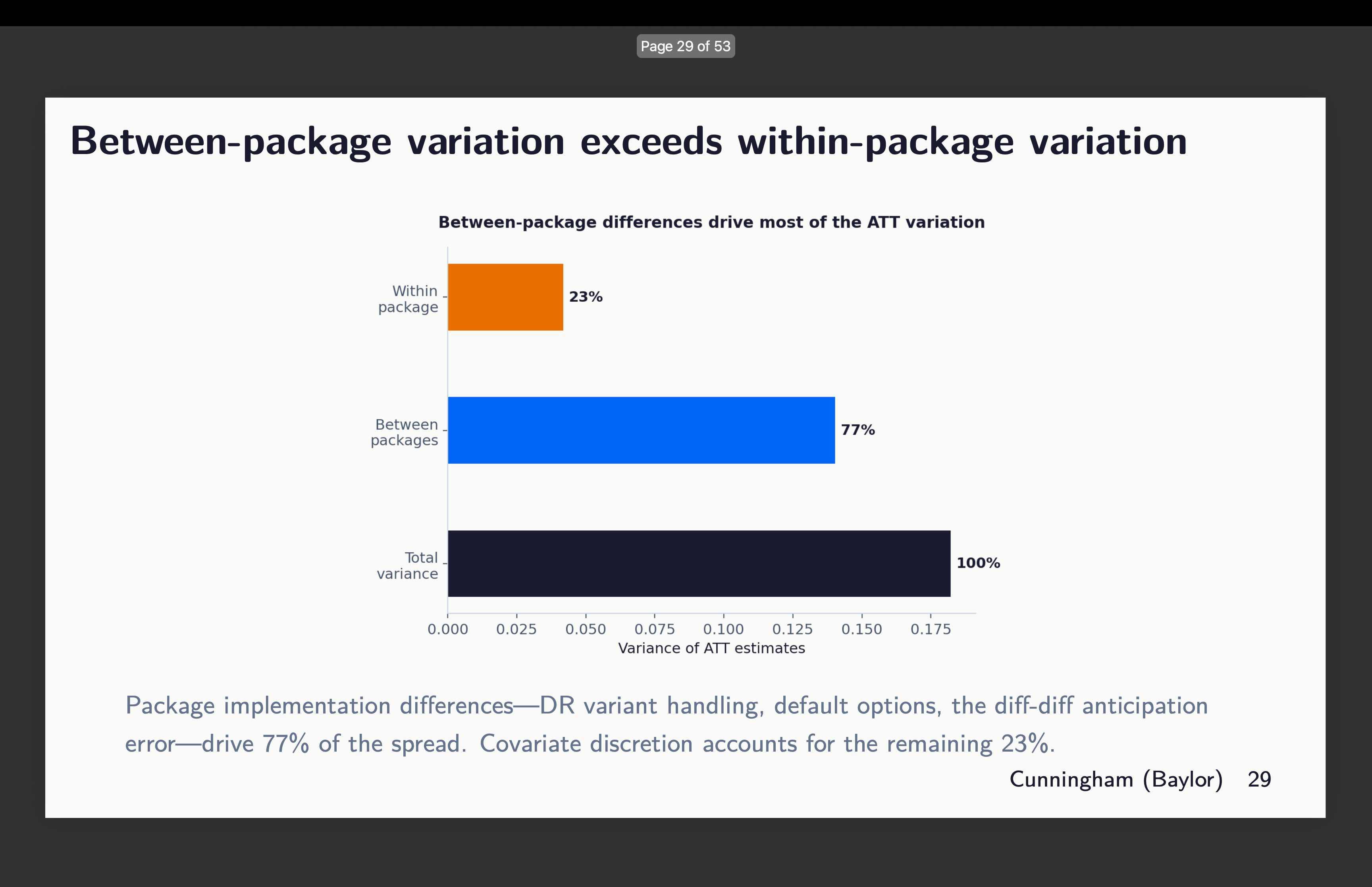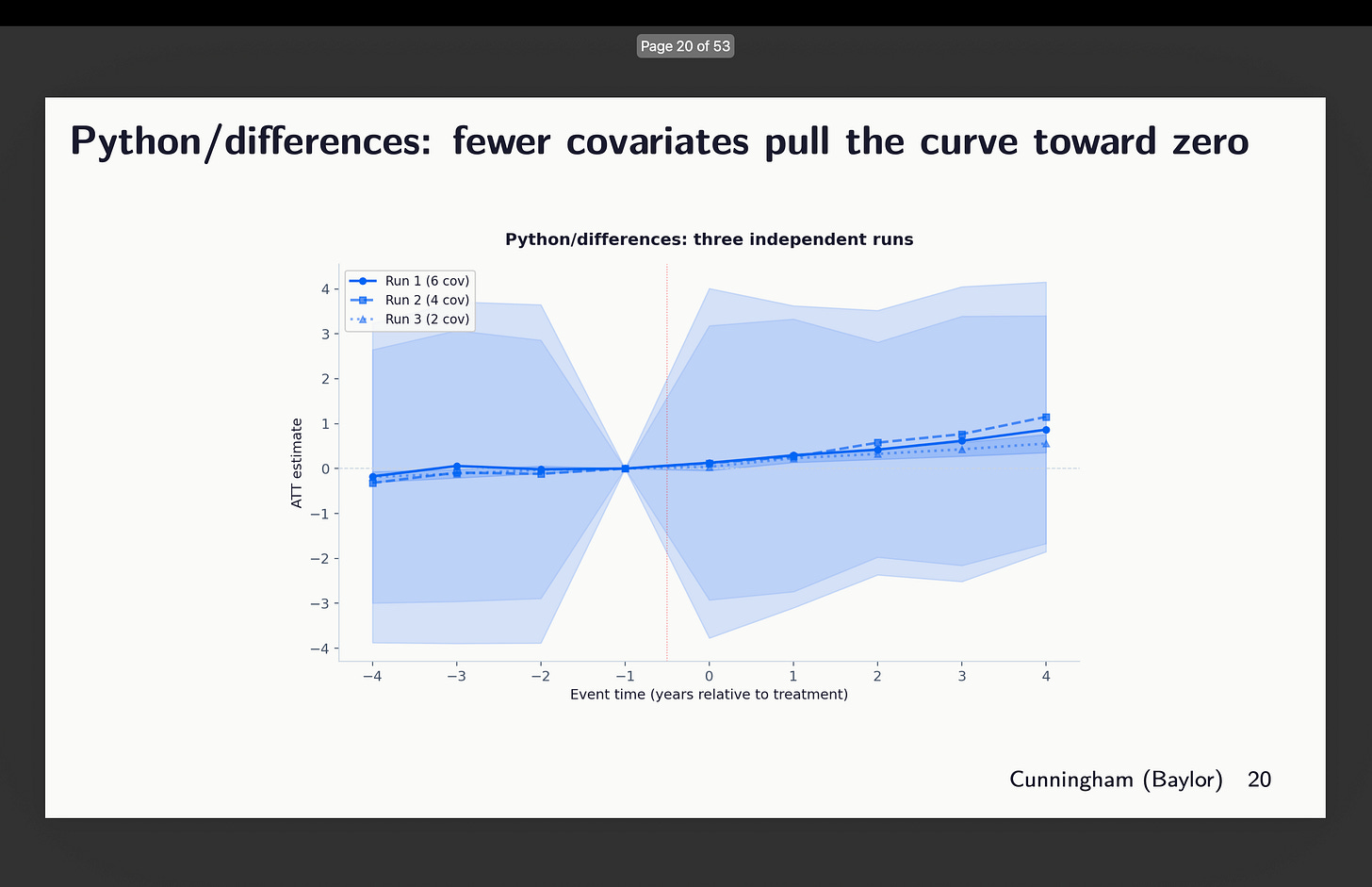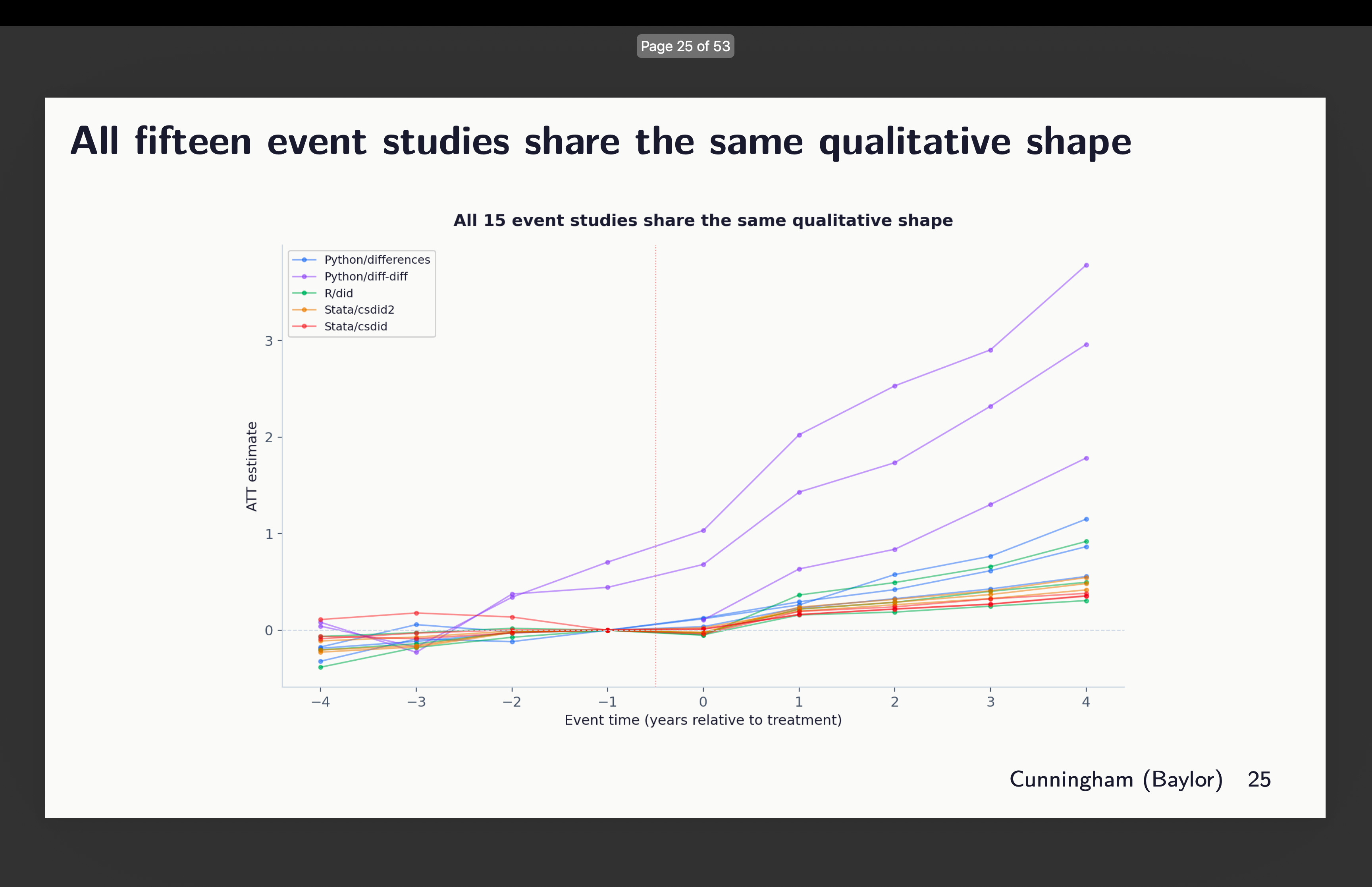 Give it some thought for a second. What number of papers have you ever ever seen that reveals variation in estimates throughout covariate choice and package deal choice? How about none? What do you usually see as a substitute? You extra typically see robustness to which diff-in-diff estimator — the well-known “all of the diff-in-diff plotted on prime of one another” graphic. However you don’t ever see somebody exploring covariates or packages. Shifting on.