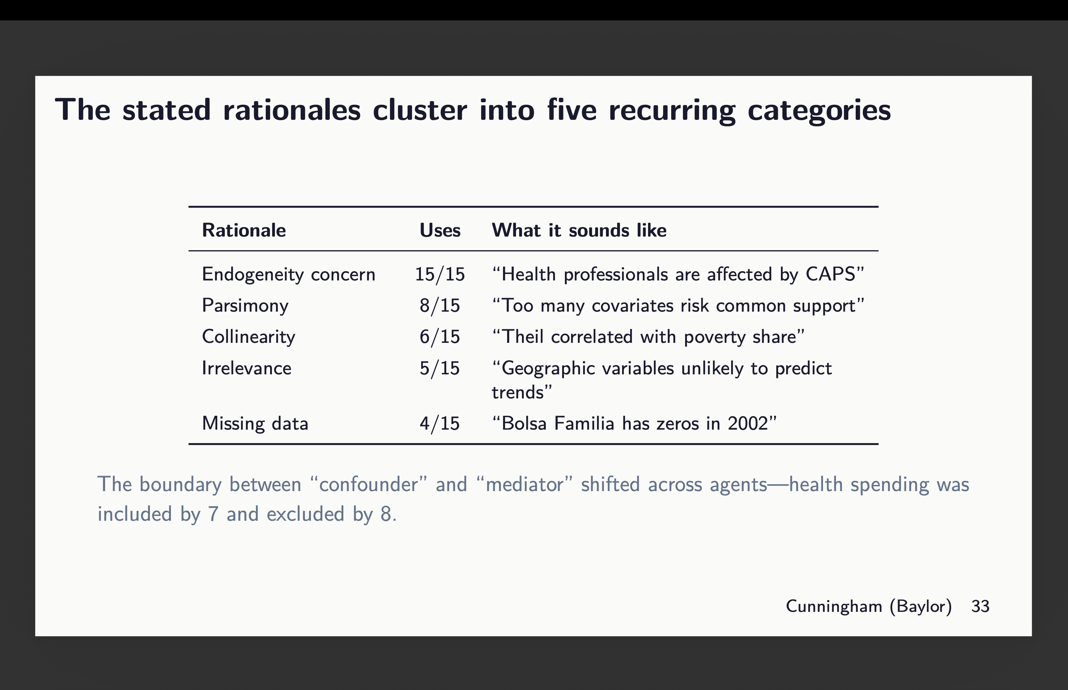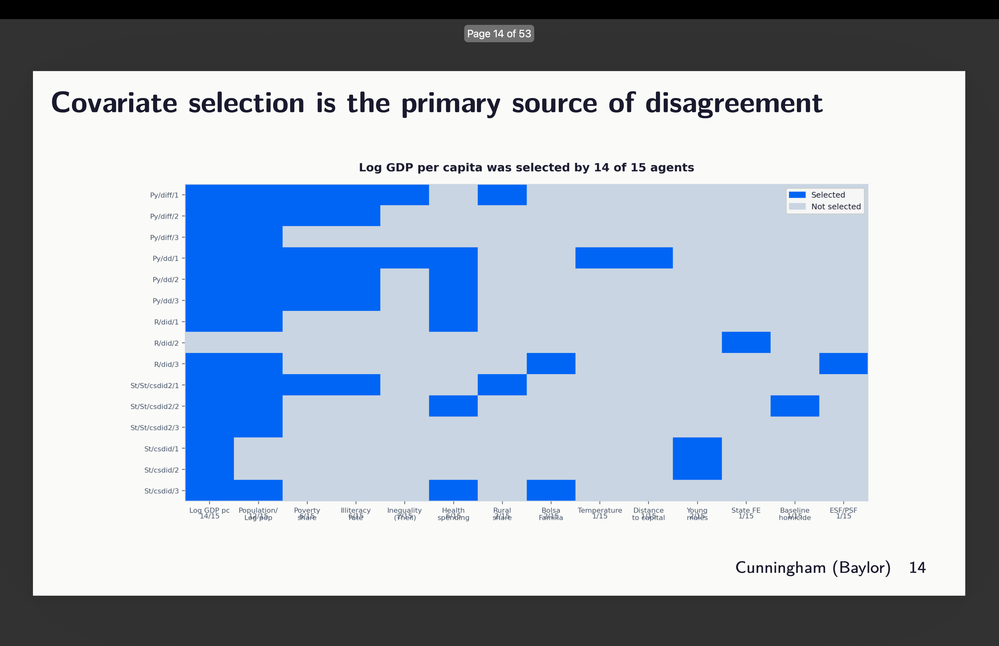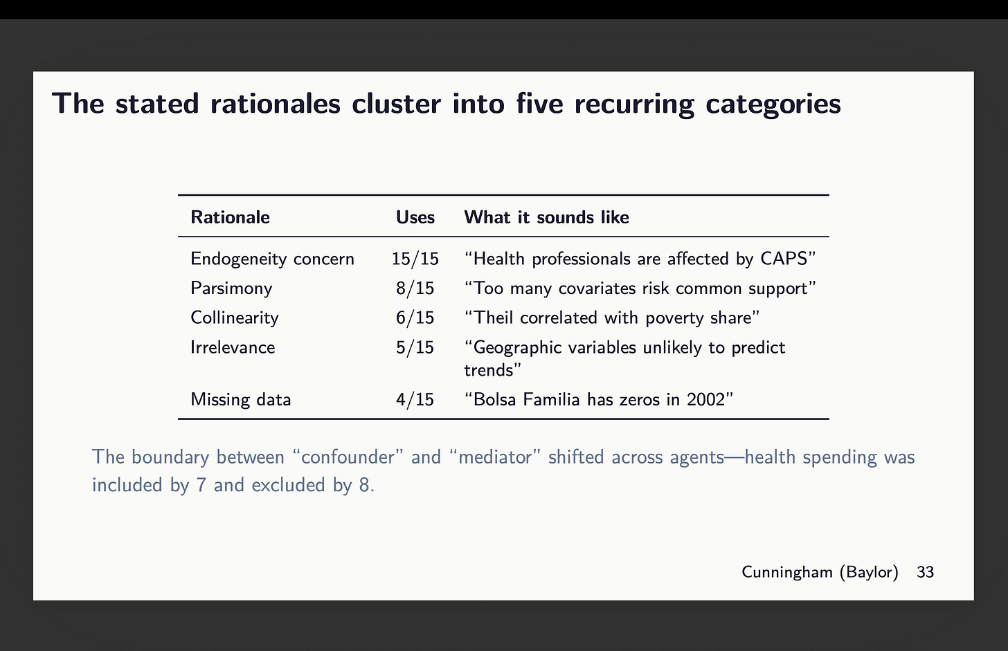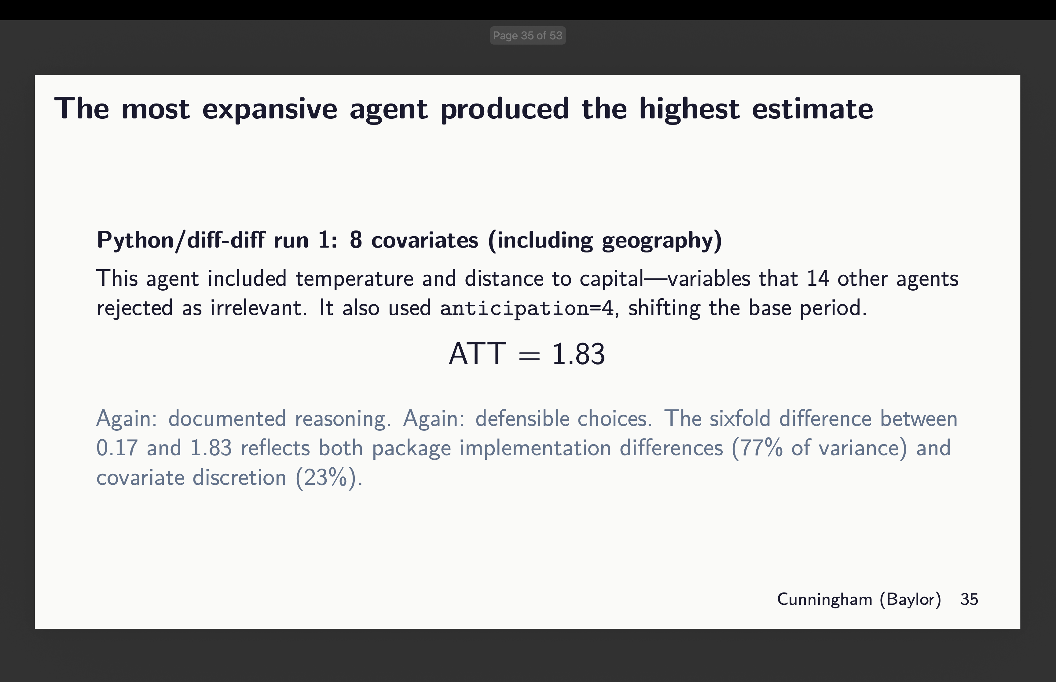 So I don’t know but the reply to the very last thing as a result of in no single case did any two brokers use the identical covariates throughout packages. So that’s nonetheless one thing I’ll look into however it’s not right here as a result of this isn’t about software program robustness; it’s about discretion on a single dimension — covariate choice. And I wager you not often have you ever heard somebody spend as a lot time explaining what and why these selected covariates as they did discuss in regards to the precise econometrics, proper? The brokers have been instructed to elucidate their rationale and right here it was:5