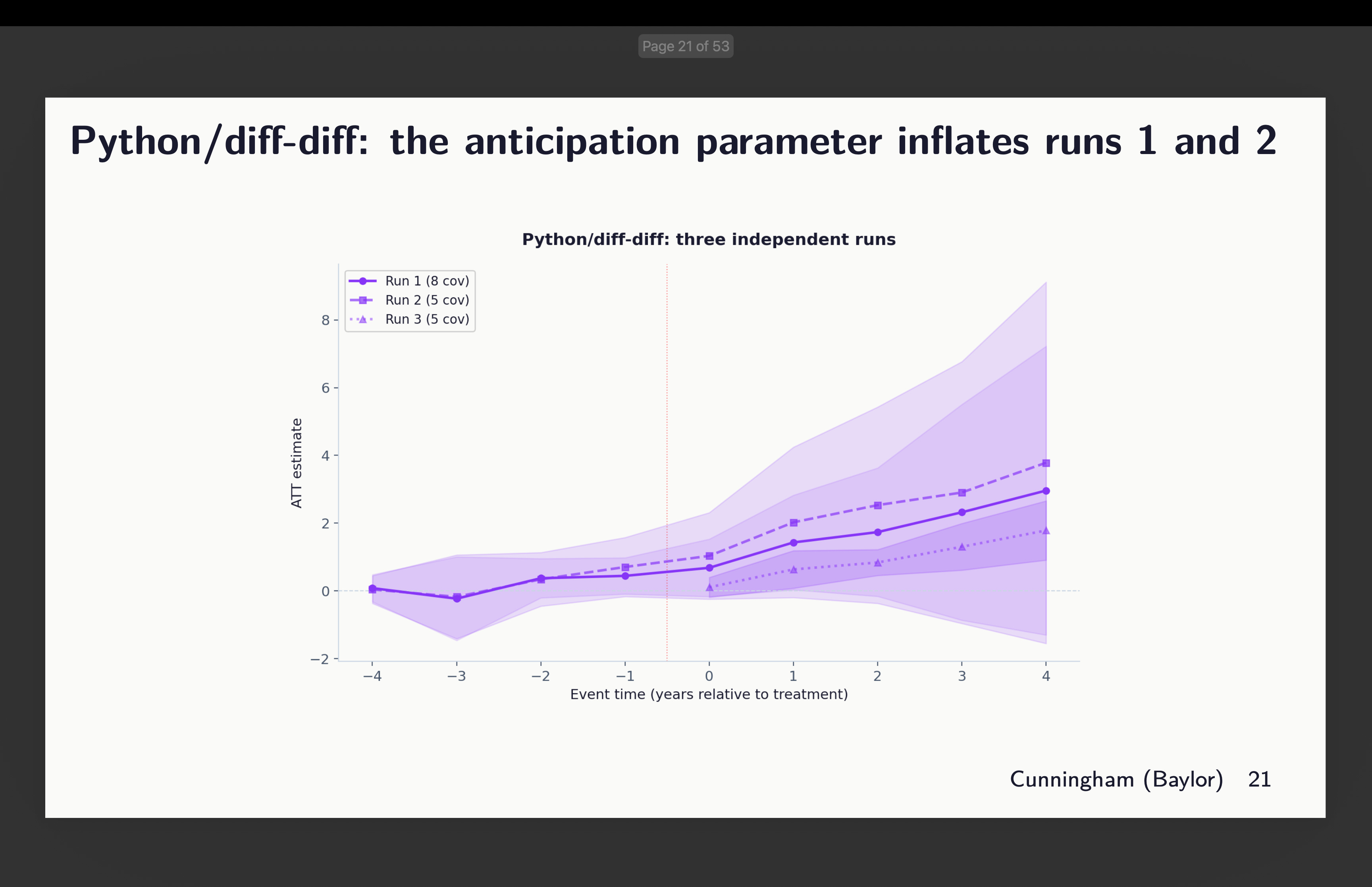 Okay, so now that is the bizarre consequence. The extra covariates included, the bigger the purpose estimates altogether. You may see that right here, however discover that the majority of that is coming from the variation throughout packages which you’ll see in the event you look intently on the colours. That massive outlier on the far proper is definitely the python diff-diff one which used each 8 covariates (therefore why it’s up there), but additionally used g-5 as its baseline. And bear in mind due to slight rising tendencies within the pre-period, by the point it will get to the tip of the durations, it’s bought a head begin and is rising. That’s why it’s averaging out to 1.75.