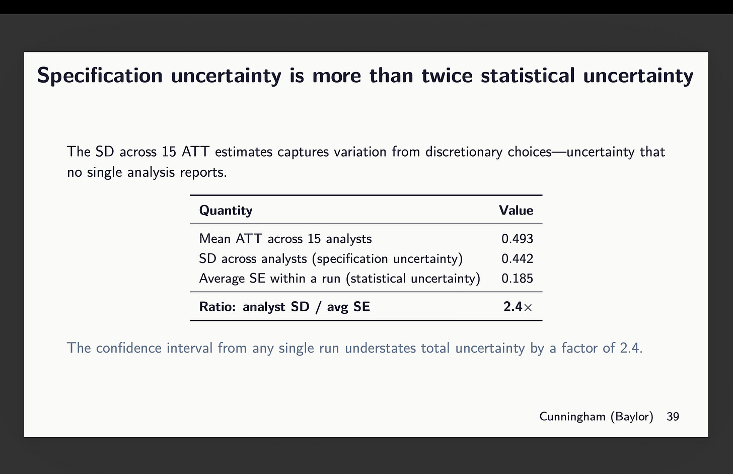 So now let that sink in. The usual errors we report are primarily based on repeated sampling. They’re designed to measure the statistical uncertainty related to the pattern and its correspondence to the inhabitants parameter. They’re not meant to measure uncertainty by which group labored on the mission. And but there’s that as a result of every group is choosing a special covariate mixture even with the identical dataset and even with the identical estimator and even with the identical experimental design.
