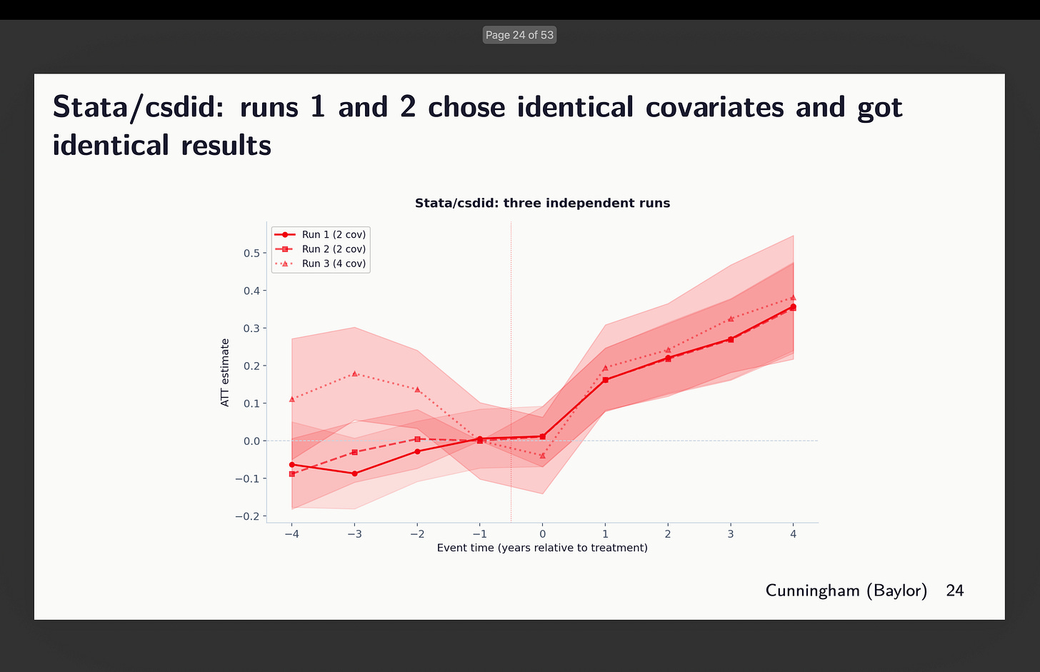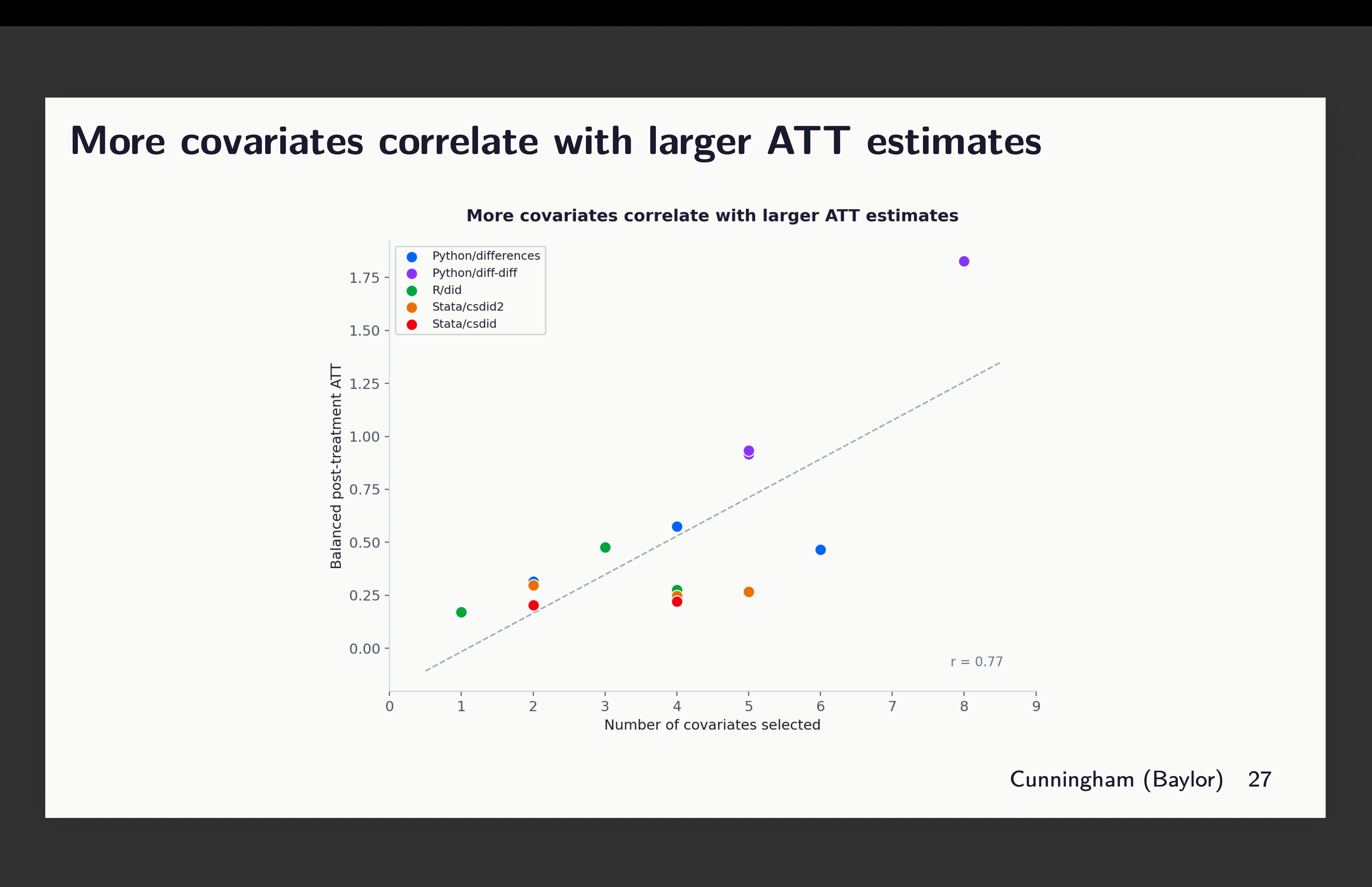 Now I need you to assume again to the final time you noticed a chat utilizing diff-in-diff when the researcher listed covariates. Did they spend extra time explaining the estimator or did they spend extra time explaining the covariates and the rationale for every considered one of them? And did they ever point out which package deal they used? I wager good cash that talked extra in regards to the CS estimator and the assumptions than they did covariates or package deal, and doubtless didn’t point out the package deal as a result of why would they? Aren’t all of the packages giving the identical factor?