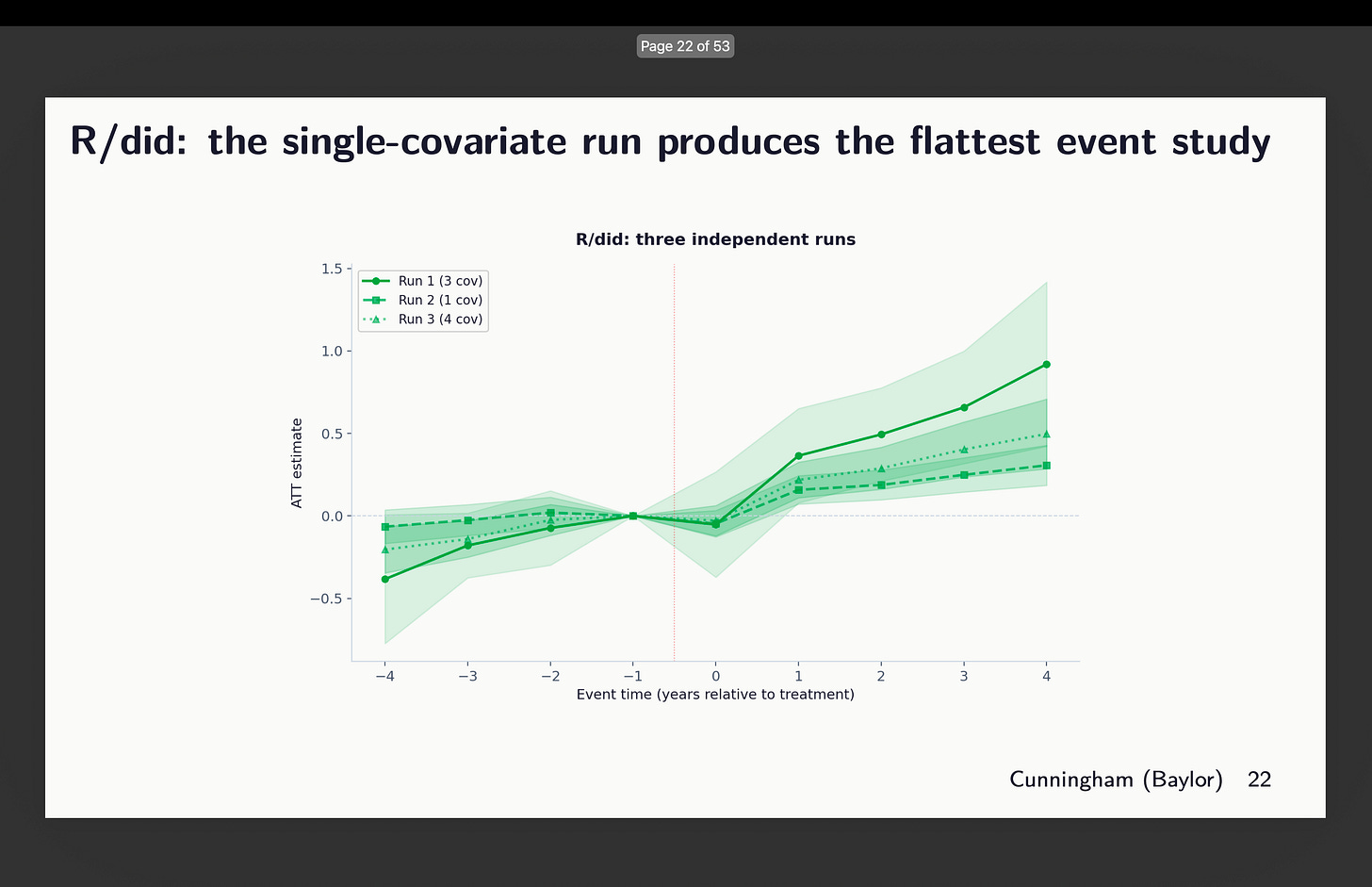 Subsequent I regarded on the occasion research plots for R’s did. And this one once more selected totally different units of covariates, however right here’s what worrying — the one which selected 3 (out of 21 covariates thoughts you) reveals indicators of tendencies, whereas the one with only one covariate seems flatter. So which is it? Which of these three do you assume satisfies conditional parallel tendencies?