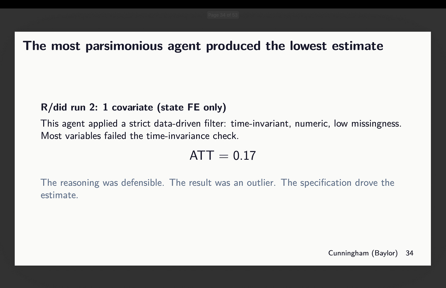 However even throwing out that outlier, you’ll be able to see nonetheless the correlation — the extra covariates included, the bigger the ATT estimate we discover, although all of those brokers use the identical dataset, technique, baseline, estimator and double strong, given solely the directions to “select covariates that fulfill parallel tendencies”. So just by choosing kind of covariates, you get bigger or smaller results alone.