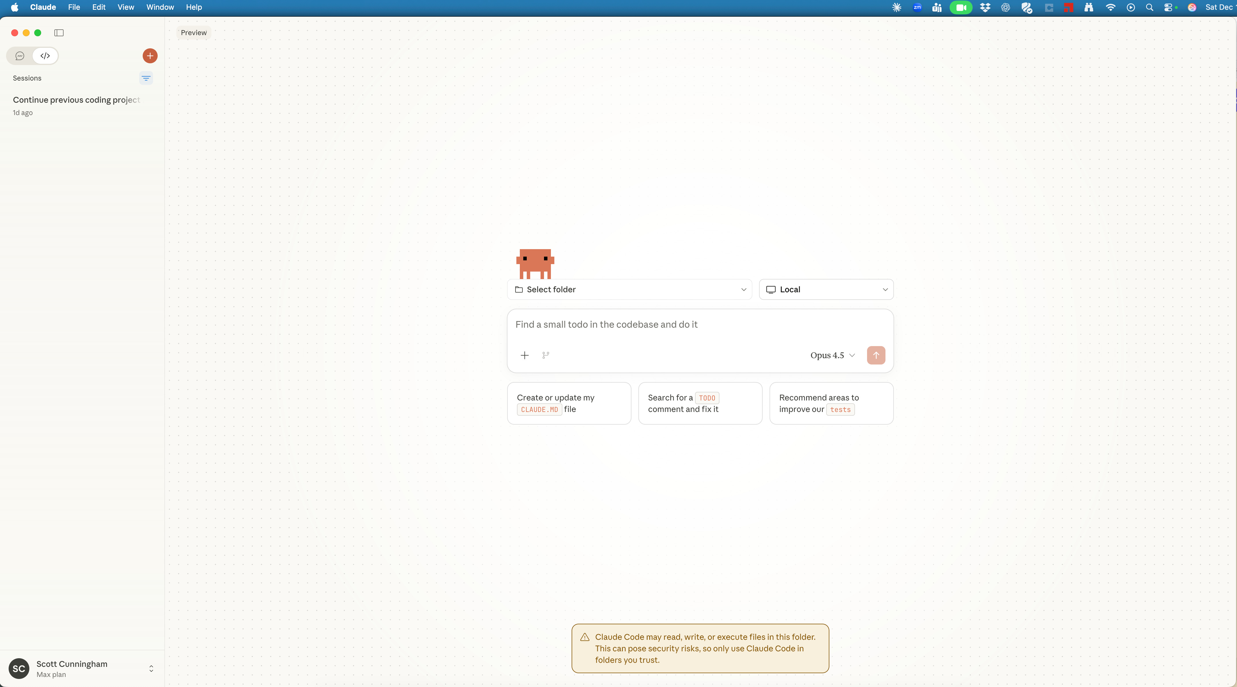 The very first thing Claude Code does if you begin a session is choose a folder (see that menu button beneath the little bug icon) which then causes it to begin a brand new session the place it’s now dwelling inside that native listing (or on GitHub) and solely in that native listing. It then reads that native listing, if that’s even the appropriate phrase. It’s much less studying than it’s “pace studying” or “turning into”. It’s very uncommon what occurs when you decide that folder.