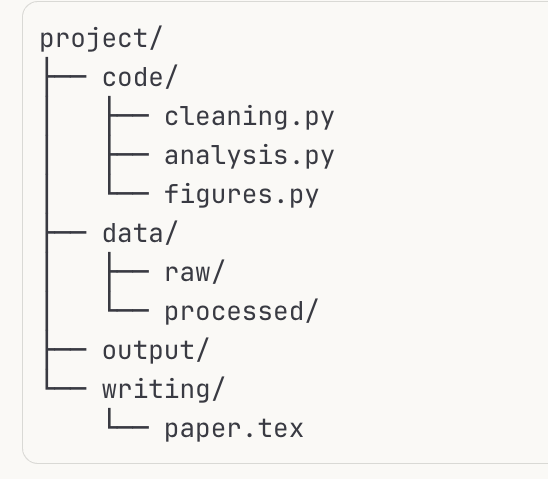 I’ve additionally traditionally struggled with holding organized directories. Each empirical researcher is aware of {that a} clear listing construction is the required (although not ample) situation for doing any empirical work. Twenty years in the past, I adopted what I assumed have been iron-clad guidelines: clear listing constructions, naming conventions, model management, and so forth. Guidelines designed to anticipate coding errors, improve my productiveness, and work higher with coauthors, coping with issues properly earlier than they ever occur by merely having a conceptual mannequin of what a structured workflow ought to appear like each time.