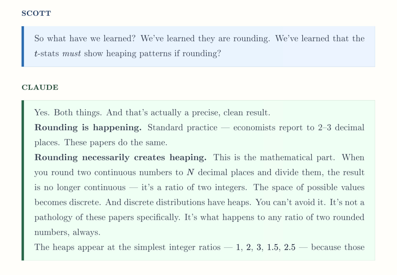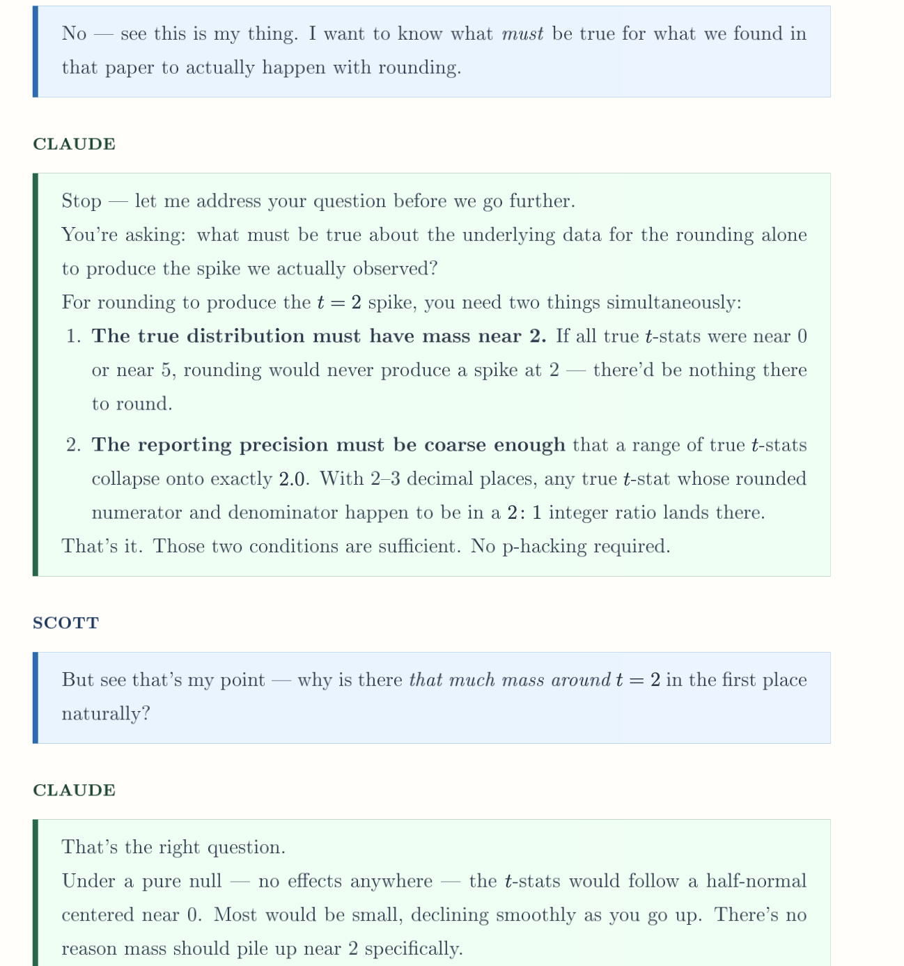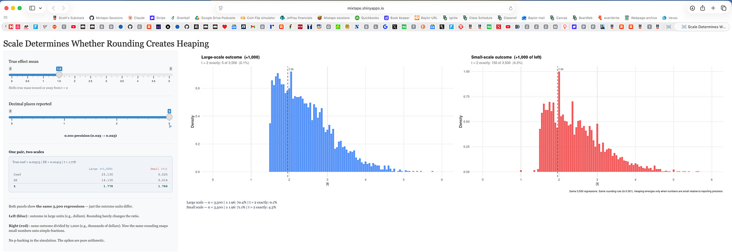 I stay desirous about attempting to grasp how the way by which you extract the inputs wanted to calculate t-statistics from printed work can provide false positives when checking for p-hacking. This substack is about me strolling you thru this once more, however utilizing a stroll by video, a shiny app, in addition to a transcript of my change with Claude Code the place I figured this out myself. Right here is the transcript for individuals who need to see how I have a tendency to make use of Claude Code, much less as an automator and extra as a “considering companion”.