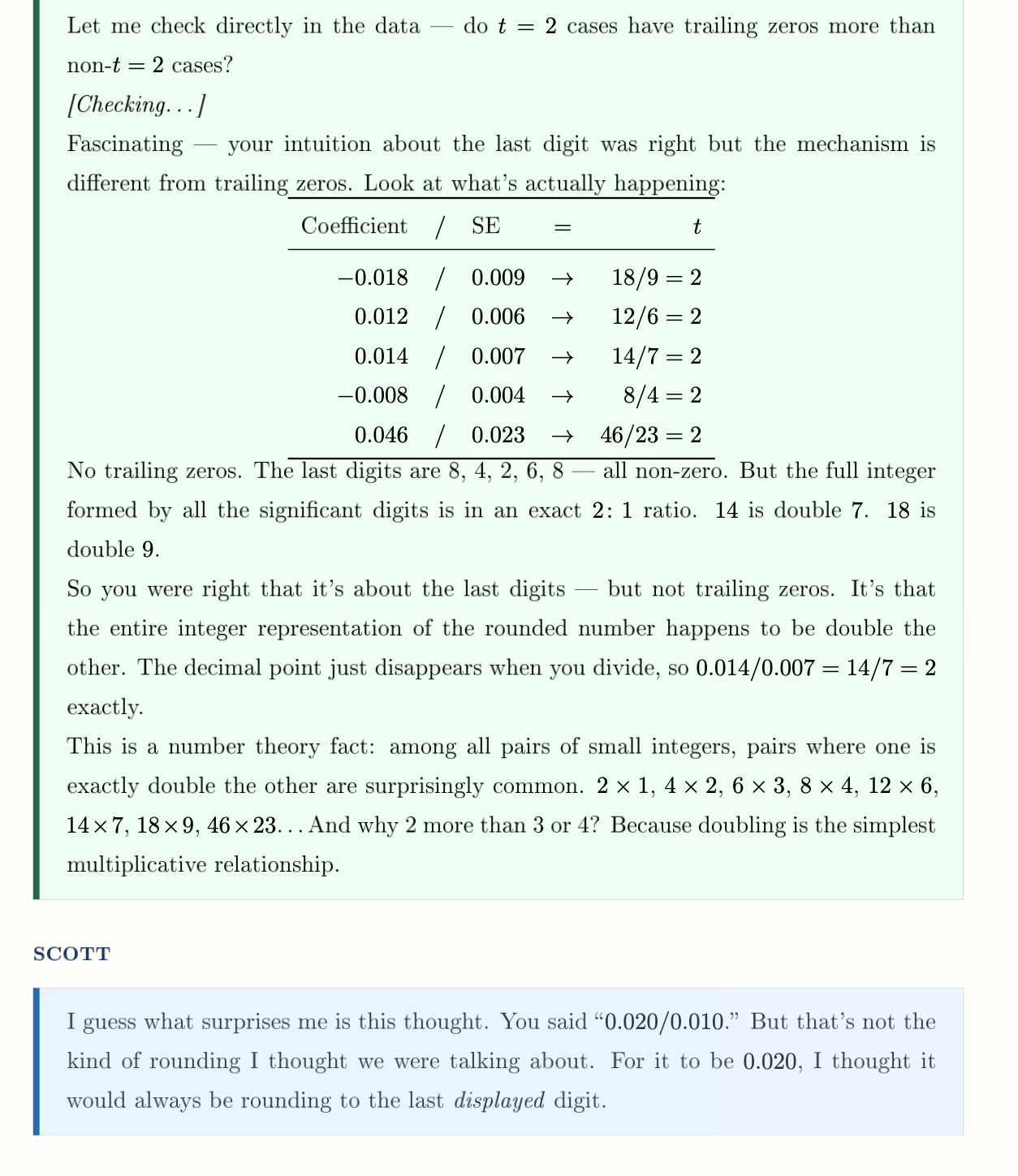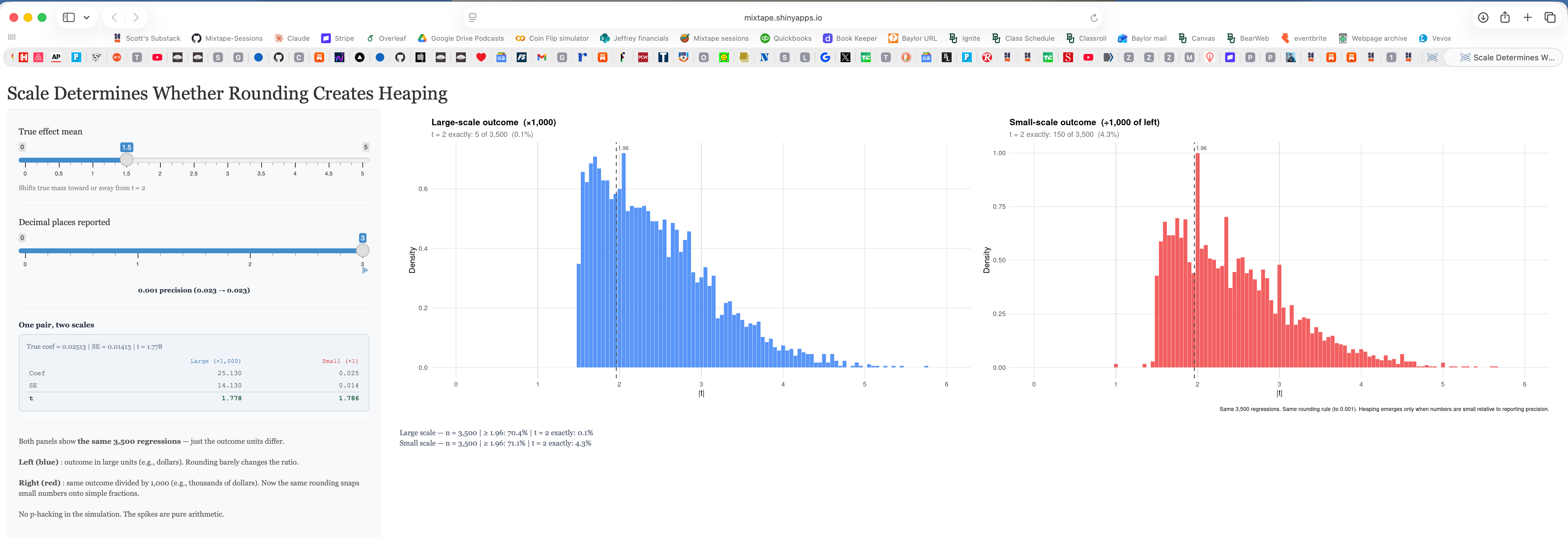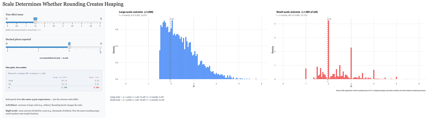 So in case you spherical coefficients and commonplace errors for tables, executed purely for rhetorical functions not scientific ones, you truly received’t change the t-statistic on your speculation assessments as a result of the t-statistic executed on your speculation assessments relies on non-rounded ones. However, in case you are a 3rd social gathering extracting the coefficients and commonplace errors from tables, which had been rounded for rhetorical functions, to assemble t-statistics, they are going to at all times be heaped regardless that the precise p-values within the papers themselves can have been executed off the true t-statistic, and never the one the third social gathering simply pulled.