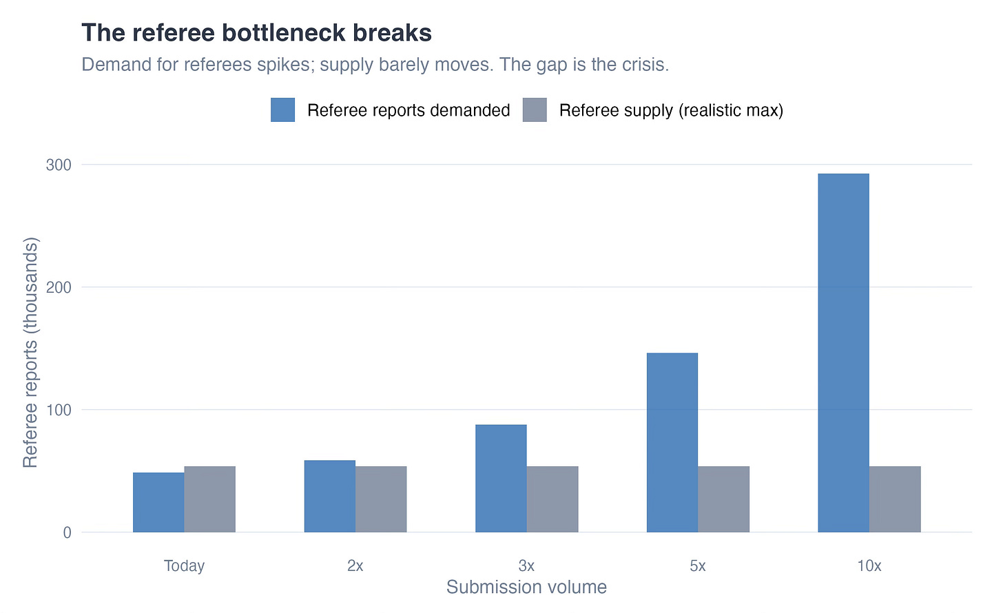 However the desk reject is barely the primary stage. The second is the refereeing. Submissions can multiply by 5x, however the referee pool can’t multiply by 5x as it’s restricted by the dimensions of the variety of PhDs. Most referees aren’t paid — similar to taxes are the worth of dwelling in a civilized society, serving as a referee is the worth of dwelling within the educational society. You’re asking tenured professors to spend 10-20 hours evaluating another person’s paper as knowledgeable obligation. At present volumes, this barely works. However at 5x, it breaks. Actually, it’ll in all probability break at 1.5x.