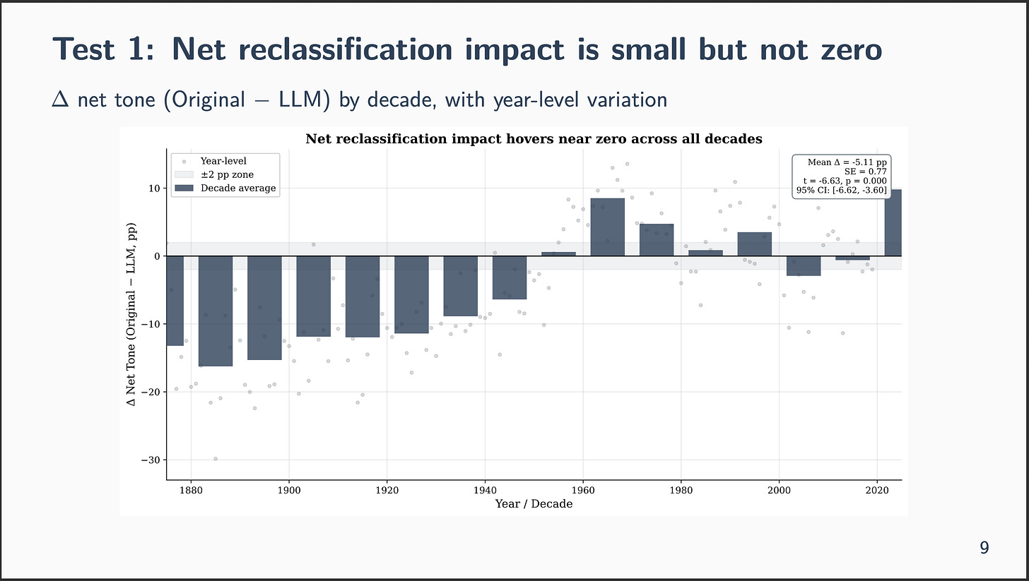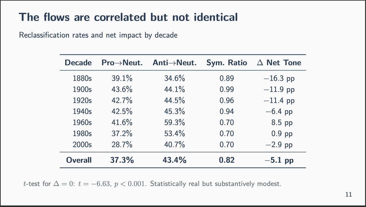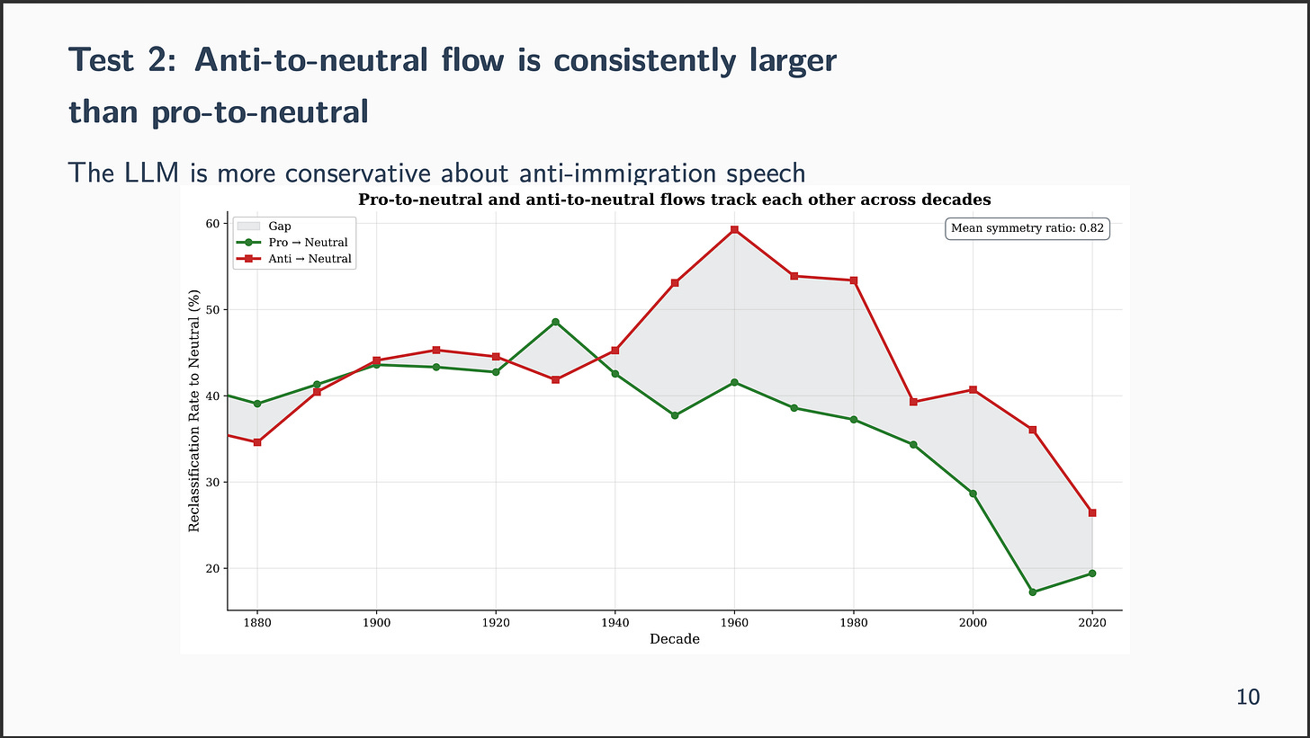 Right here’s the speculation I stored coming again to. The important thing measure in Card et al. is web tone — the share of pro-immigration speeches minus the share of anti-immigration speeches. It’s a distinction. And when the LLM reclassifies, it’s overwhelmingly pulling speeches towards impartial from either side. 33% of Professional goes to Impartial. 44% of Anti goes to Impartial. Direct flips between Professional and Anti are uncommon — solely about 4-5%.