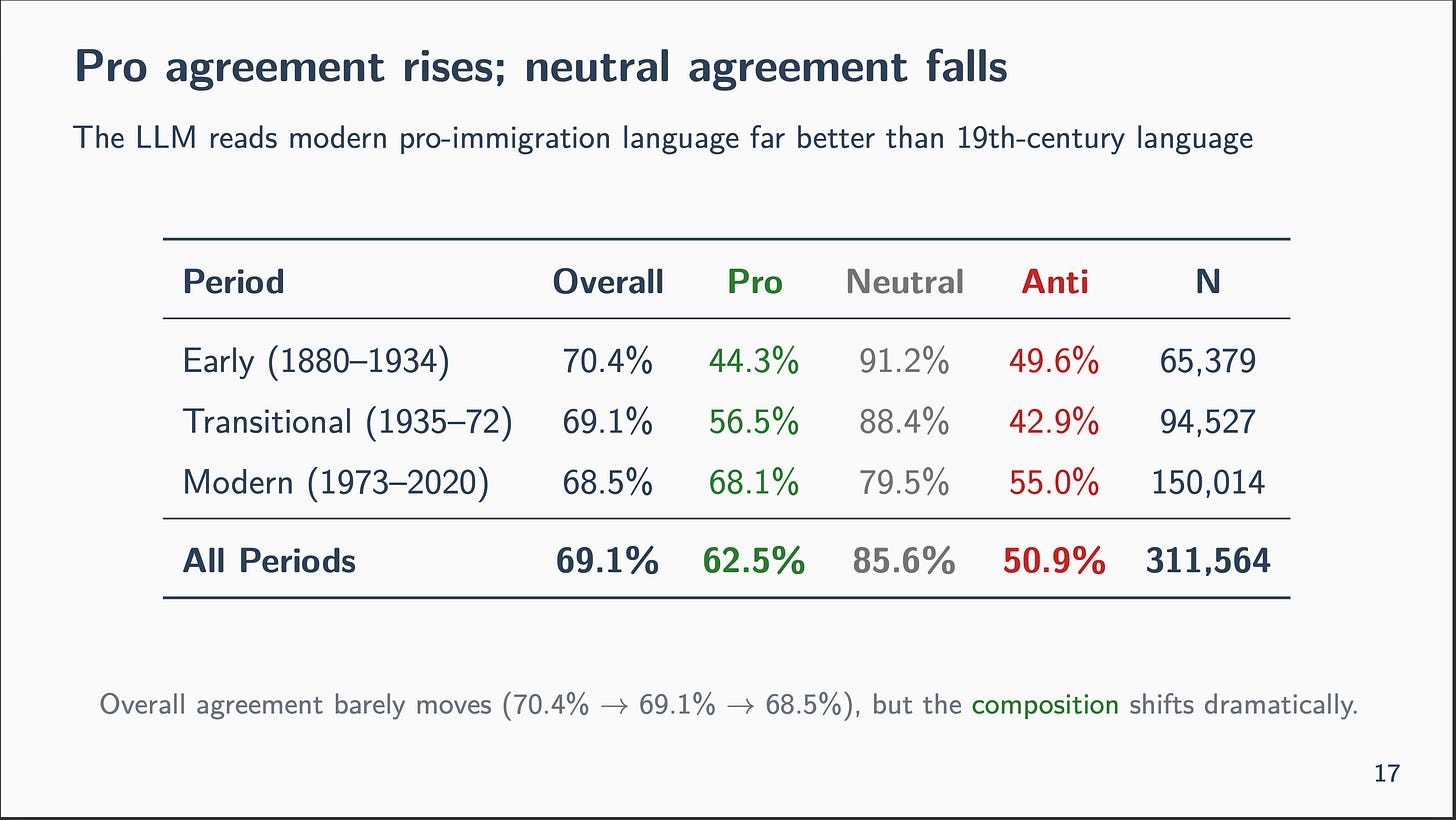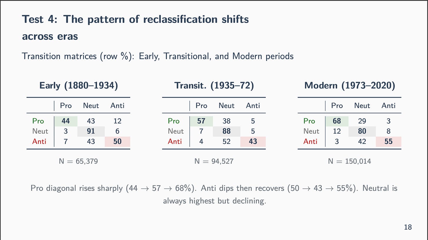 However beneath that steady floor, the composition rotates dramatically. Professional-immigration settlement rises from 44% within the early interval to 68% within the fashionable period. Impartial settlement falls from 91% to 80%. They cancel in combination — a unique sort of balancing act, hiding in plain sight.