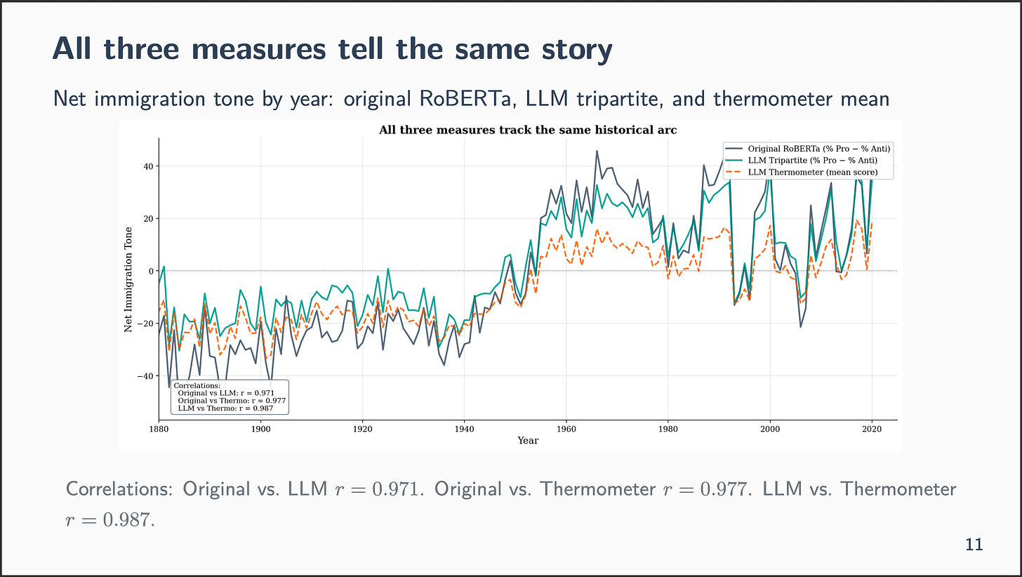That consequence was attention-grabbing at first, however then stored bugging me. How will you reclassify 100,000 speeches, roughly saying that the unique RoBERTa mannequin was fallacious, and but all subsequent evaluation finds nearly the very same issues? What does that even suggest about measurement itself?