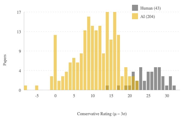 In order you possibly can see above in these graphics, just a few AI papers do crack the highest 40 out of 247 whole entries. Which is what you’d anticipate if the AI papers come from the conventional distribution, as bear in mind the tails of the conventional can theoretically attain detrimental infinity (blinding of their awfulness) to optimistic infinity (one in one million spectacular). And the newest cohort they’ve been engaged on, too, is already enhancing with a barely larger 7.6% win fee.