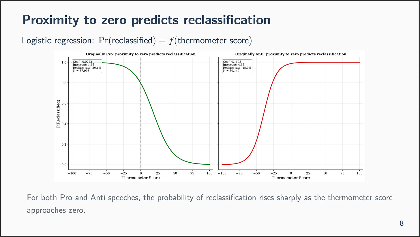 Third, and most formally: we ran logistic regressions asking whether or not proximity to zero on the thermometer predicts the likelihood of reclassification. It does. Speeches close to the boundary are much more prone to get reclassified than speeches on the poles. The connection is monotonic and robust.