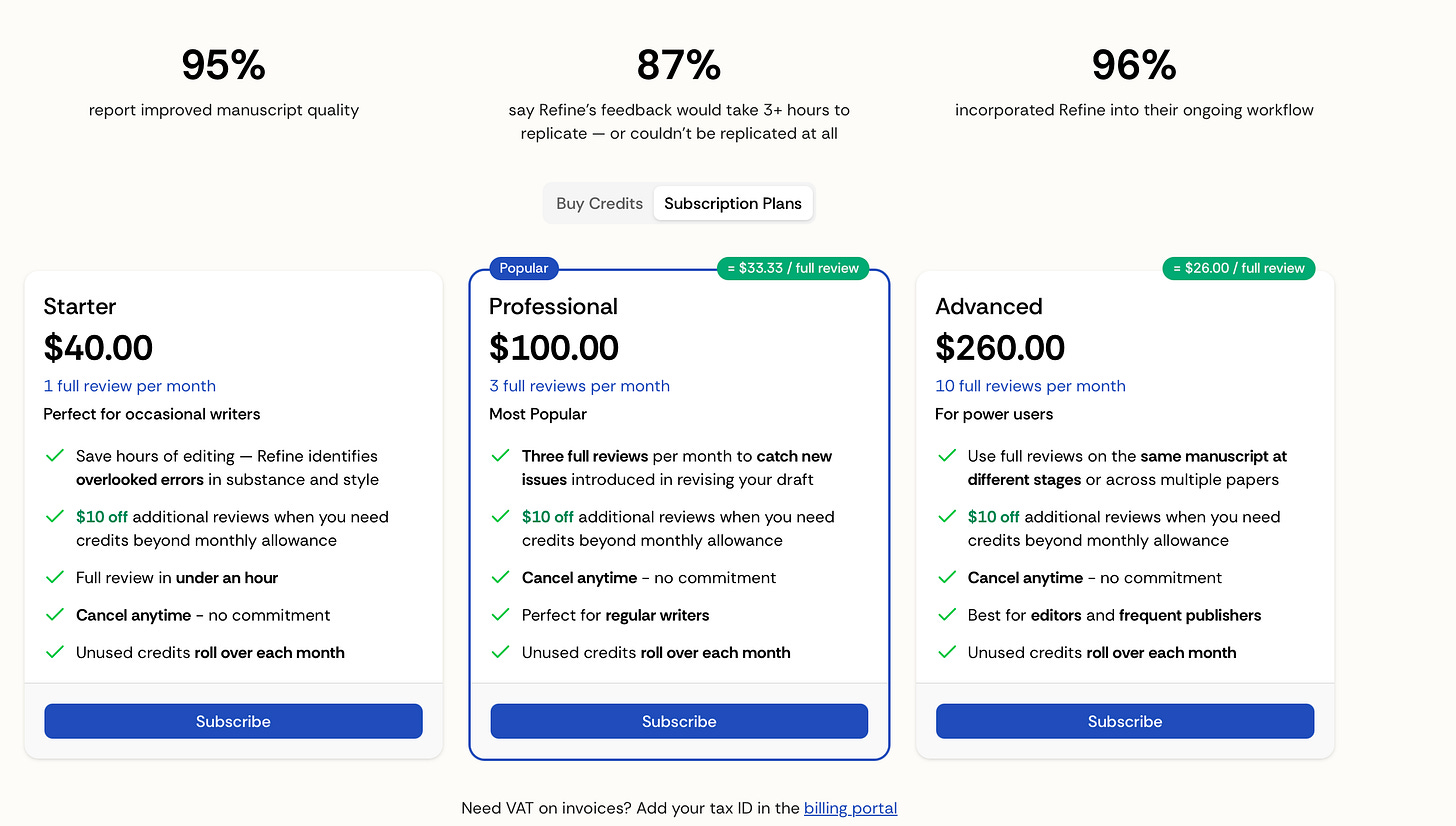 So what fills the hole? The identical factor inflicting the issue: LLMs. The trustworthy reply would possibly make individuals uncomfortable however think about this — people weren’t being paid to referee within the first place. It has all the time been voluntary and unpaid labor. The human-centric system has run ok for many years to centuries, relying on what we imply, however be mindful two issues: for many of the historical past of science, human peer evaluation didn’t exist, and secondly, human peer evaluation has helped trigger well-documented types of publication biases together with replication crisises. I feel refine.ink sees a shift in direction of intensive use of LLMs for refereeing as a really close to equilibrium situation as a result of take a look at the third possibility beneath their subscription mannequin — “finest for editors and frequent publishers”.