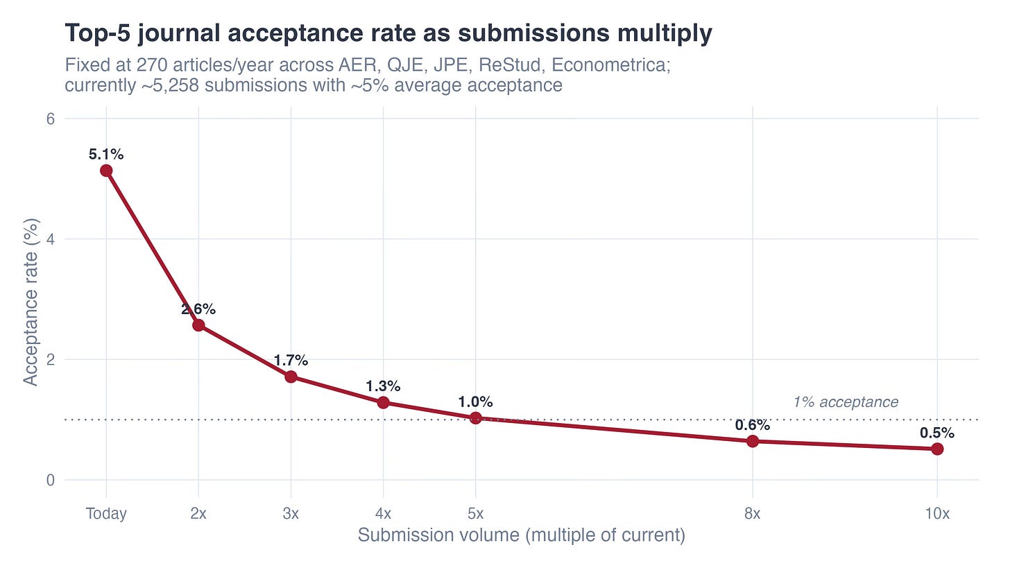 There are roughly 12,000 research-active economists who undergo ranked journals. At the moment they generate about 39,000 submissions per 12 months — roughly 3 per researcher. If the common goes from 3 to 10, that’s a 3x improve from present authors alone. However then add in new entrants who beforehand couldn’t produce at submission high quality and also you’re at 4-5x. Which is how I arrive at 5x.