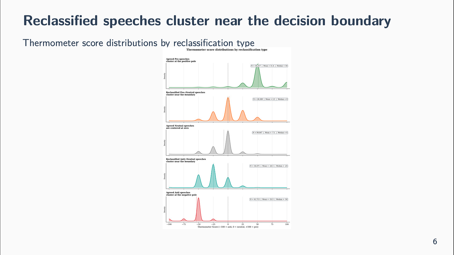 The prediction: if reclassification is admittedly about marginal circumstances, the speeches that bought reclassified ought to cluster close to zero. They had been all the time borderline. The LLM simply known as them in a different way.