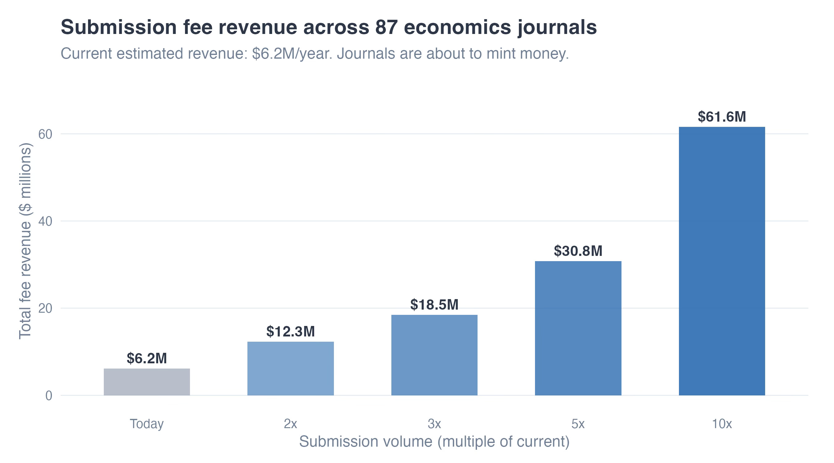 At present volumes, these 87 journals acquire roughly $6.2 million per 12 months in submission charges. At 5x, that’s $31 million. The highest-5 alone would go from $812,000 to $4.1 million — principally from papers that get desk rejected inside per week.
