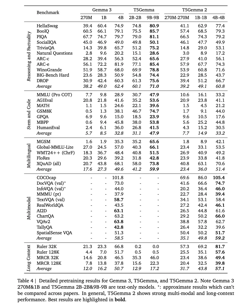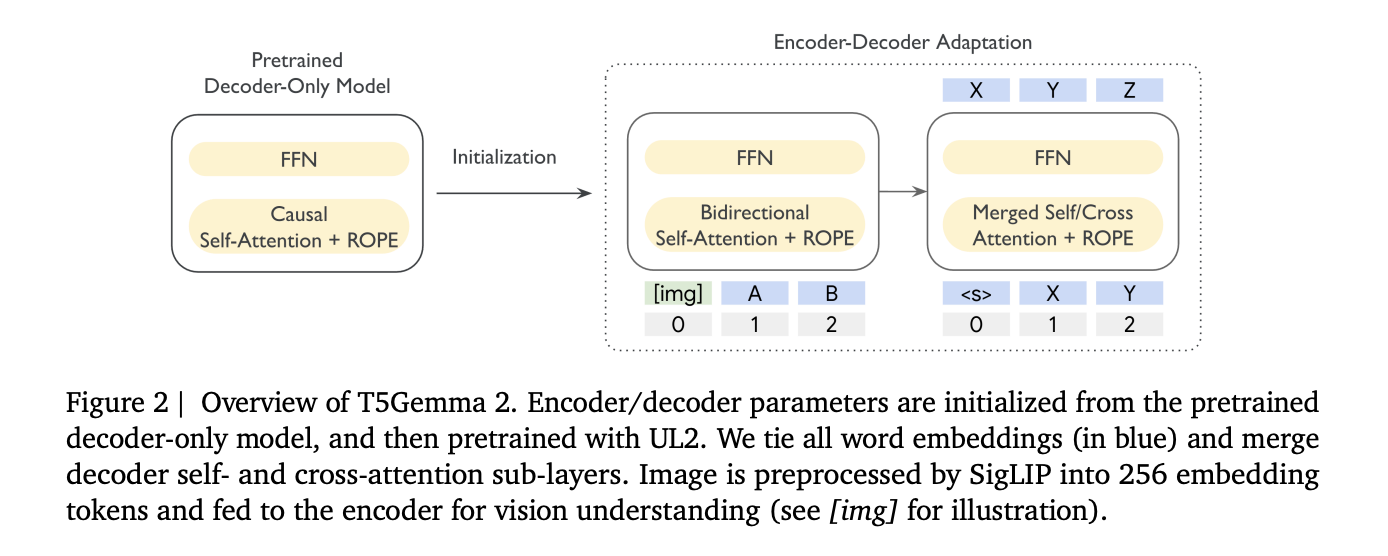 - T5Gemma 2 is an encoder decoder household tailored from Gemma 3 and continued with UL2, it reuses Gemma 3 pretrained weights, then applies the identical UL2 based mostly adaptation recipe utilized in T5Gemma.