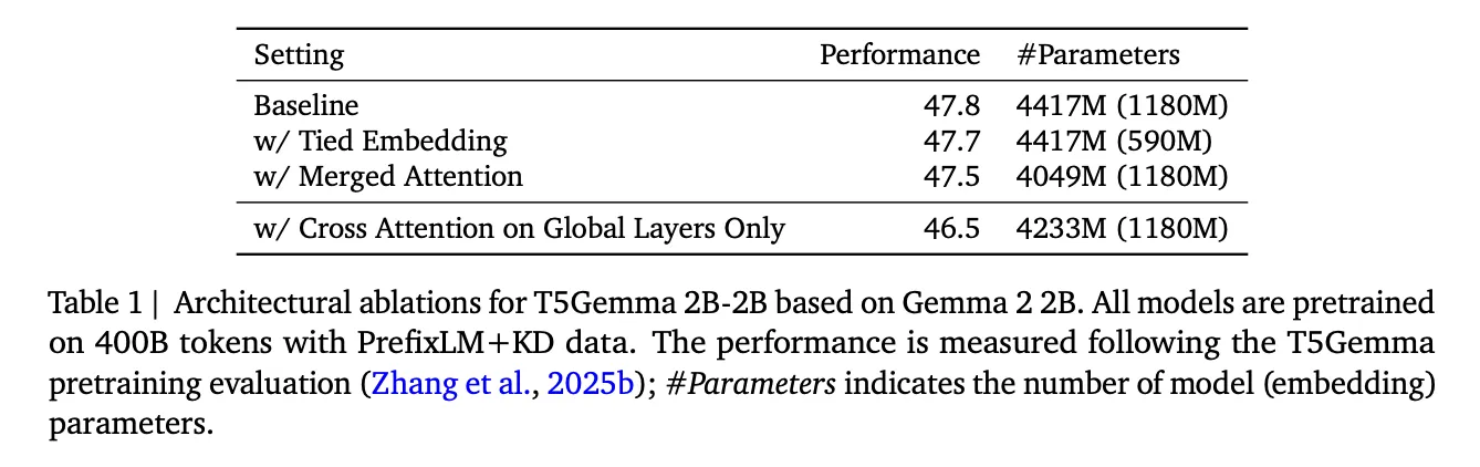 Second, it introduces merged consideration within the decoder. As a substitute of separate self-attention and cross-attention sublayers, the decoder performs a single consideration operation the place Ok and V are shaped by concatenating encoder outputs and decoder states, and masking preserves causal visibility for decoder tokens. This ties to simpler initialization, as a result of it narrows variations between the tailored decoder and the unique Gemma fashion decoder stack, and it experiences parameter financial savings with a small common high quality drop of their ablations.