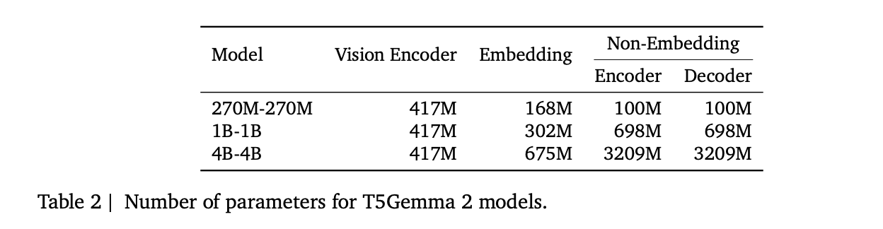 The discharge consists of 3 pretrained sizes, 270M-270M, 1B-1B, and 4B-4B, the place the notation means the encoder and decoder are the identical dimension. The analysis crew experiences approximate totals excluding the imaginative and prescient encoder, about 370M, 1.7B, and 7B parameters. The multimodal accounting lists a 417M parameter imaginative and prescient encoder, together with encoder and decoder parameters damaged into embedding and non embedding elements.
