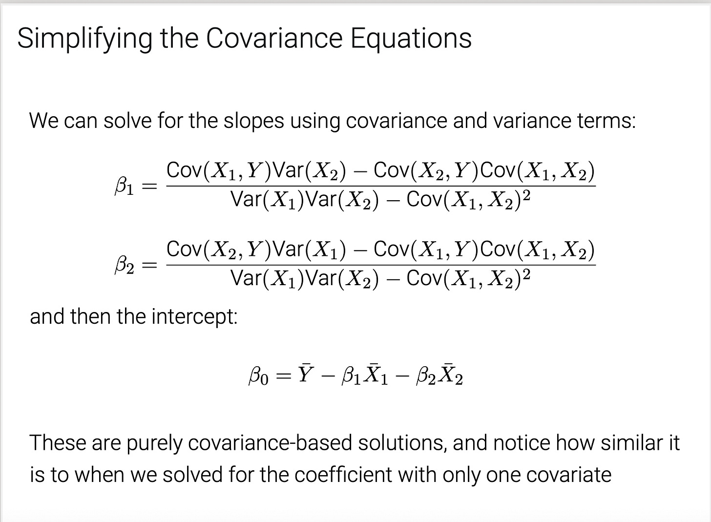 First I needed them to study the components for calculating a regression coefficient while you solely have on covariate and I gave it to them because the covariance between the result and the covariate divided by the variance of the covariate, or what I repeatedly simply known as a “scaled covariance”. The screenshot for that is right here.