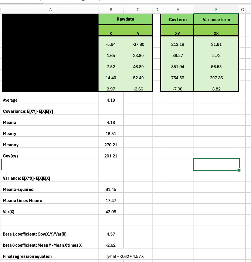 What I like about this one is that I gave them a dataset of 5 observations labeled “uncooked information”. The components for calculating a regression coefficient, like I stated, has two elements: the numerator (covariance) and the denominator (variance). And inside every, there’s some issues that I believe college students actually don’t all the time perceive and that’s that generally they’re taking a mean first after which multiplying two issues (“the product of the averages”) however generally they do the identical factor in reverse order (“the typical of the product”). So utilizing the “small dataset” they use the excel formulation and calculate merchandise and averages themselves, after which mix them to get covariance and variance, after which use these to get the regression coefficients on the intercept (beta_0) and the slope coefficient (beta 1) itself.