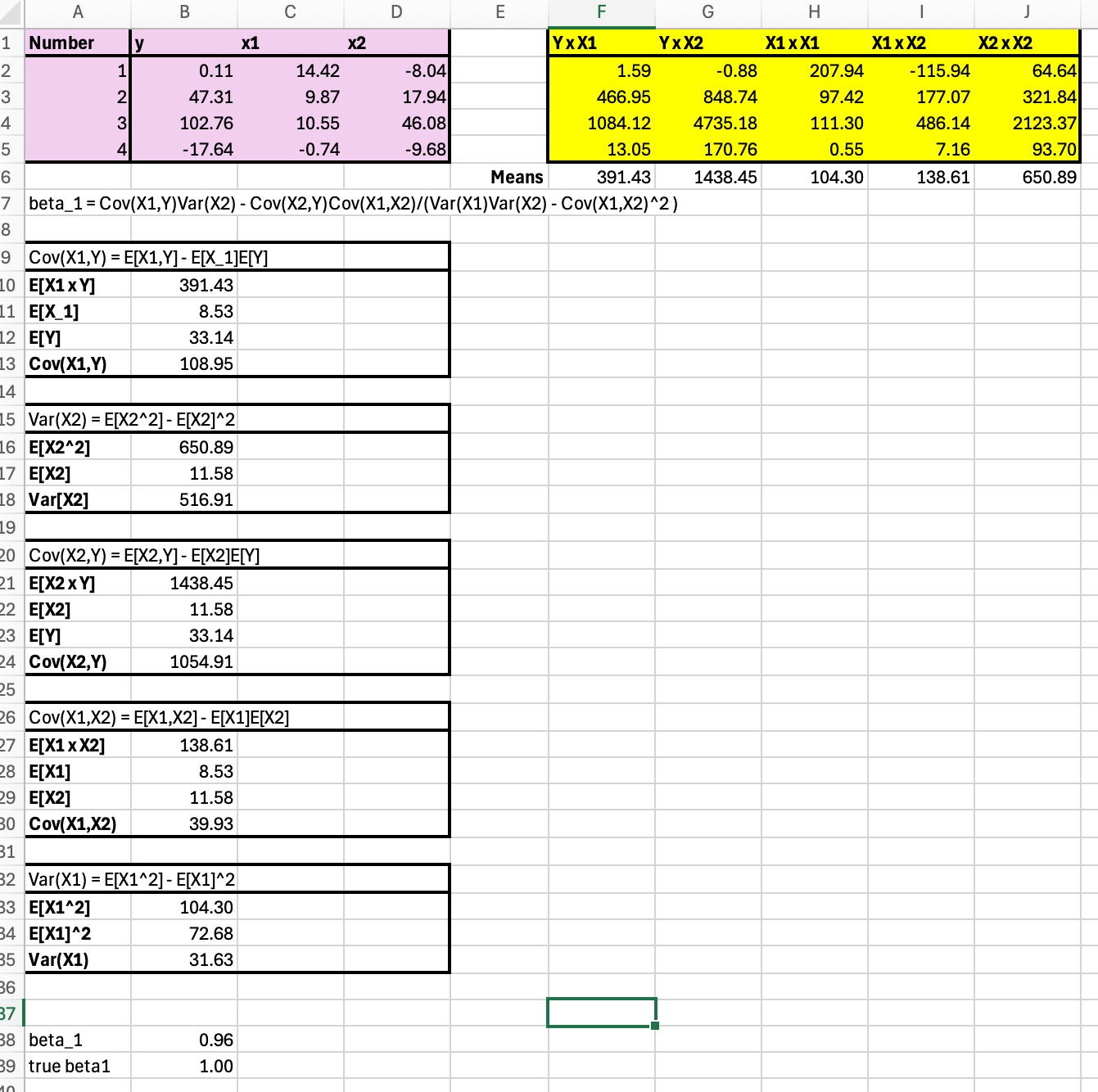 Calculating regression coefficients from a multivariate regression (two covariates) manually utilizing a small dataset of 4 observations.