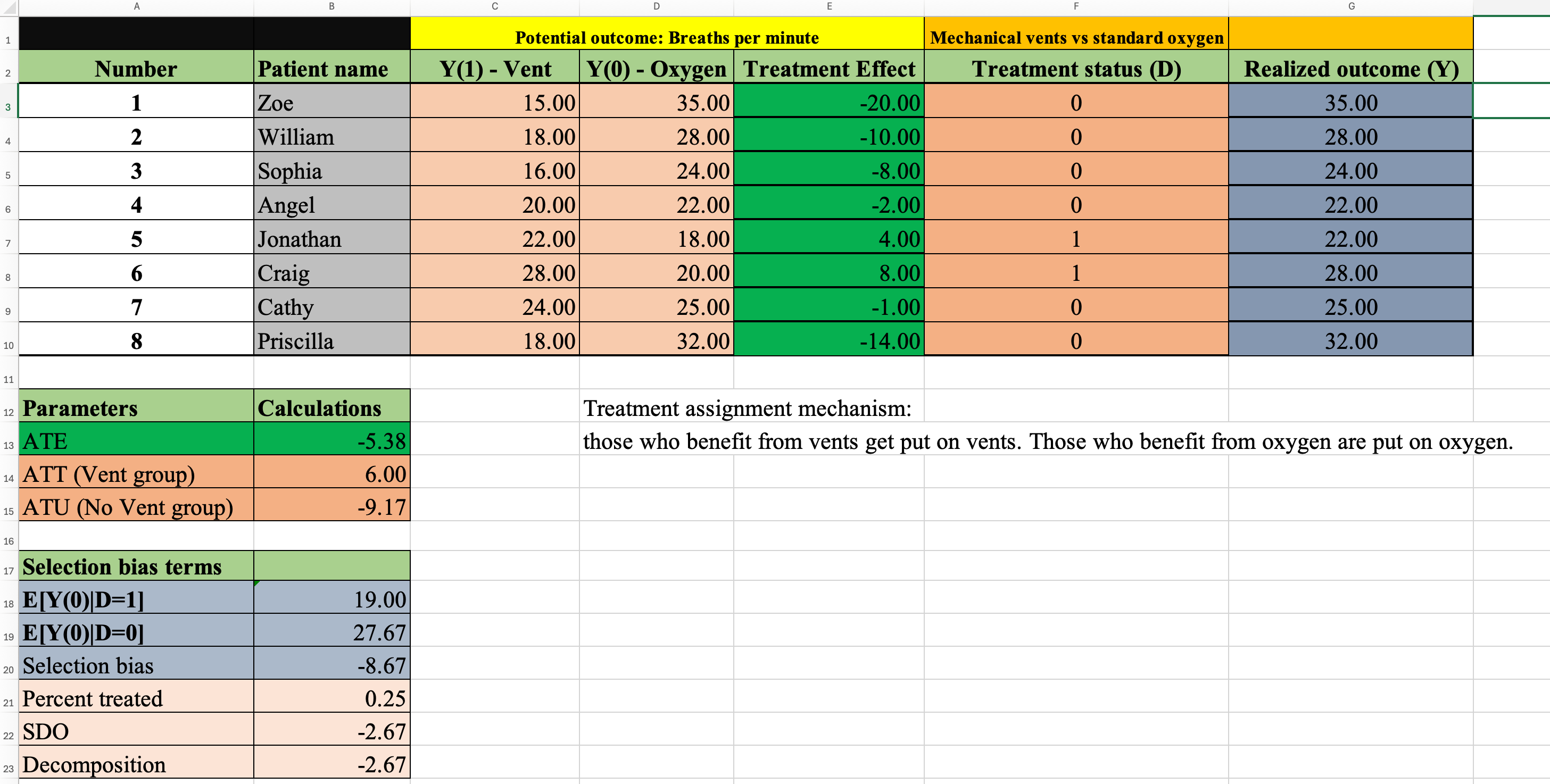 I gained’t clarify the decomposition right here; I’ll simply level you to my guide that does. And I’ll present a hyperlink beneath to the spreadsheet for individuals who need it in addition to entrance web page so you may see it right here in a screenshot. Nevertheless it’s my sturdy opinion that this decomposition is essential for understanding causal inference, and so I wish to discover a approach to assist them study it too, and muscle reminiscence by means of repetition is how I selected to do it.