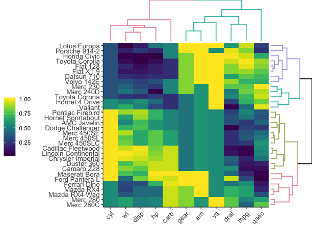 For instance, working the next code will produce an interactive cluster heatmap of the mtcars dataset (after rating the columns and normalizing them to vary from 0 to 1):