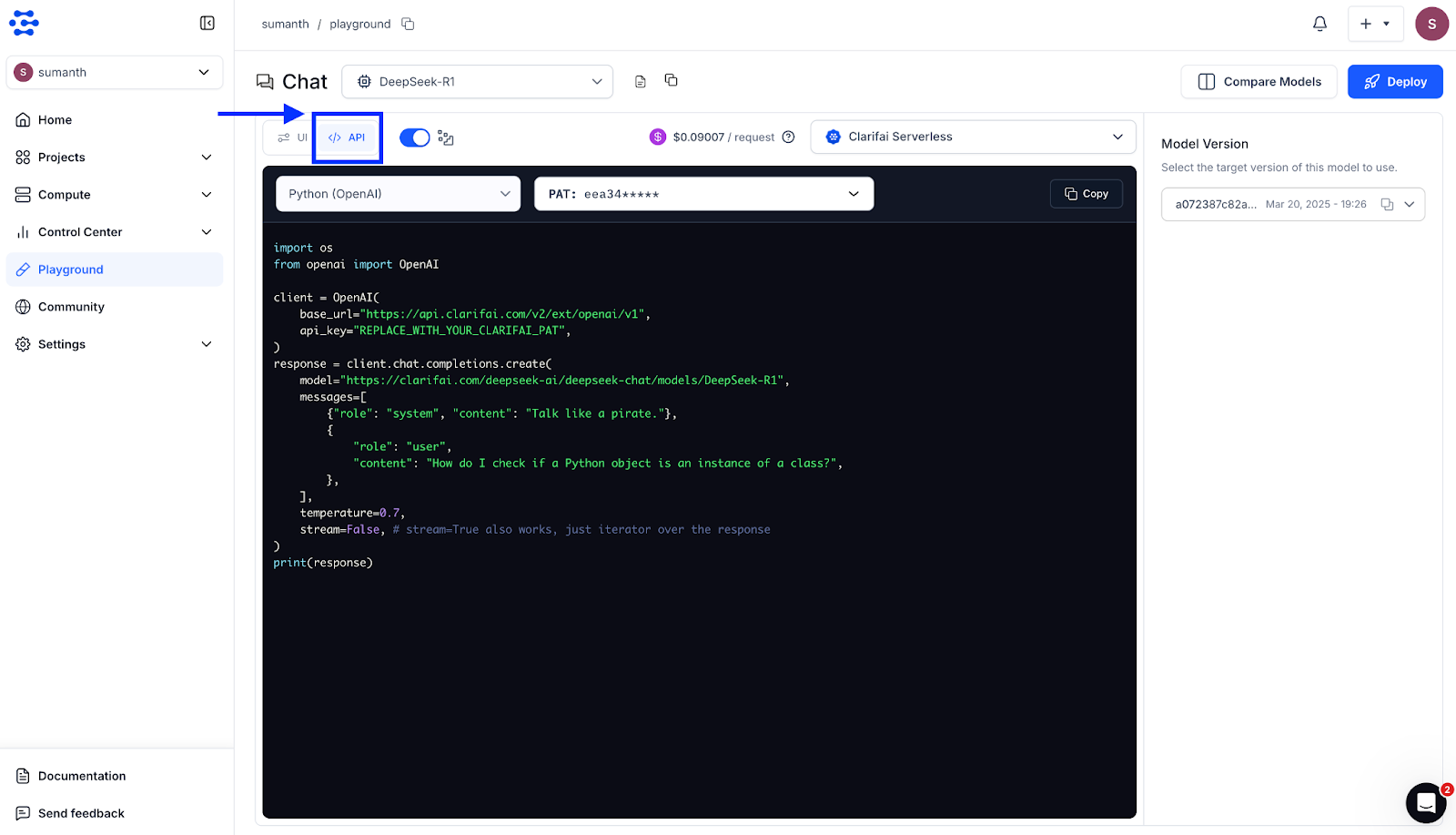 DeepSeek fashions will be accessed on Clarifai in 3 ways: via the Clarifai Playground UI, through the OpenAI-compatible API, or utilizing the Clarifai SDK. Every methodology gives a distinct degree of management and suppleness, permitting you to experiment, combine, and deploy fashions in line with your improvement workflow.