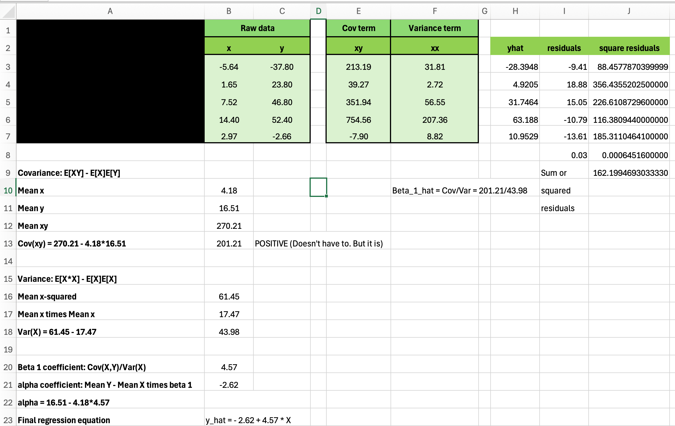 And see that is the place I launched covariance and variance. I gave them a “dataset” of 5 items (columns B and C), and confirmed them precisely the formulation for covariance, variance and the intercept and coefficient on the RHS covariate. This was an additional credit score task additionally price +2 factors on the following midterm, and it had be accompanied by an R quarto doc that estimated regression coefficients utilizing: