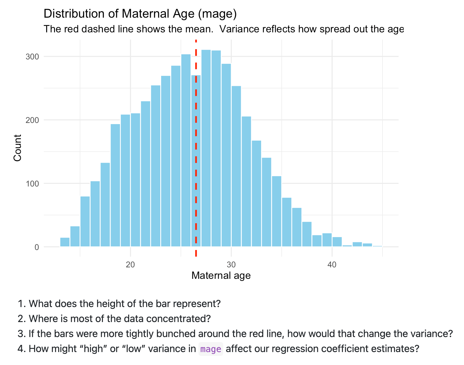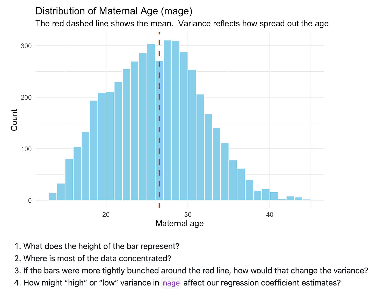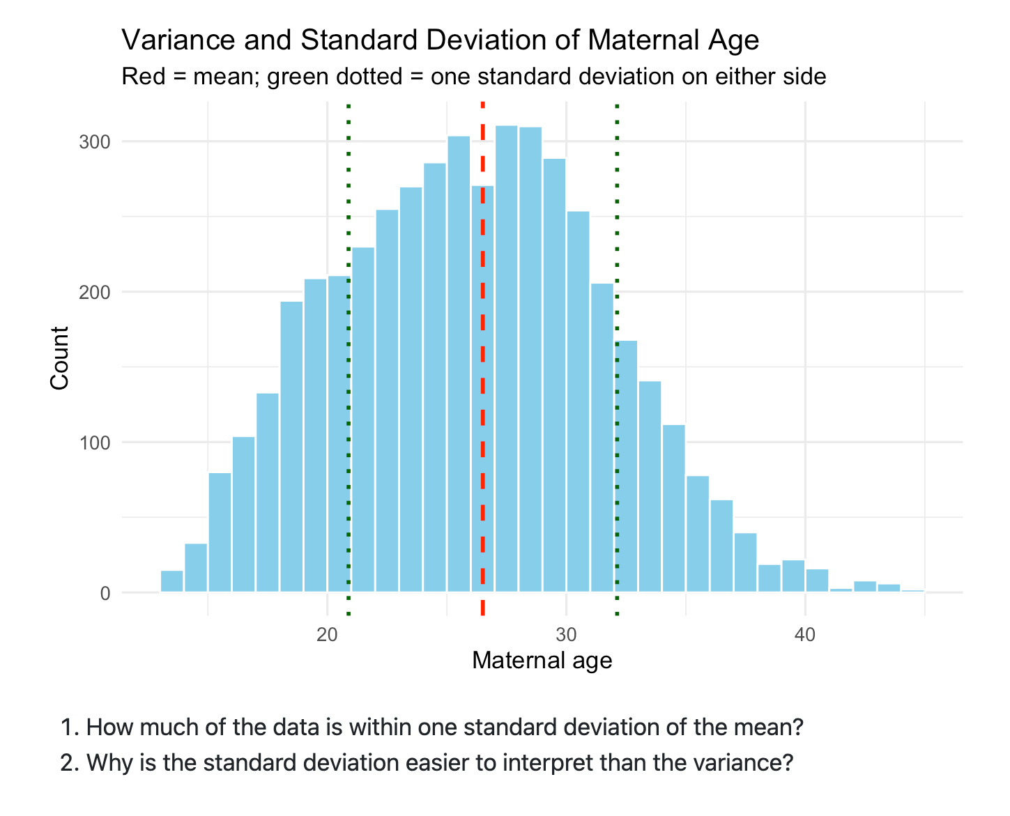 Additionally I’m speaking about commonplace deviations inside variance by simply speaking about variance as having squared the items and thus turns into onerous to speak about. As an illustration, within the above image, I’ve plotted maternal age. And so the variance is “age-squared” which isn’t actually a pure approach of speaking. However since the usual deviation takes the sq. root of the variance, its items return to the unique type of “age”, and that’s straightforward to speak about. So then I’ve them do make utilizing ggplot the identical plot however with commonplace deviations proven: