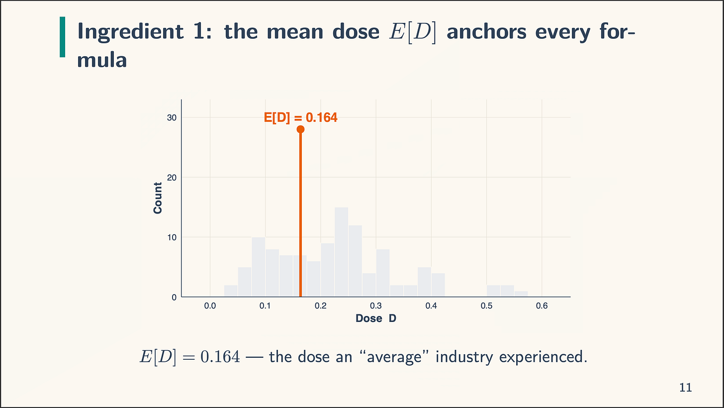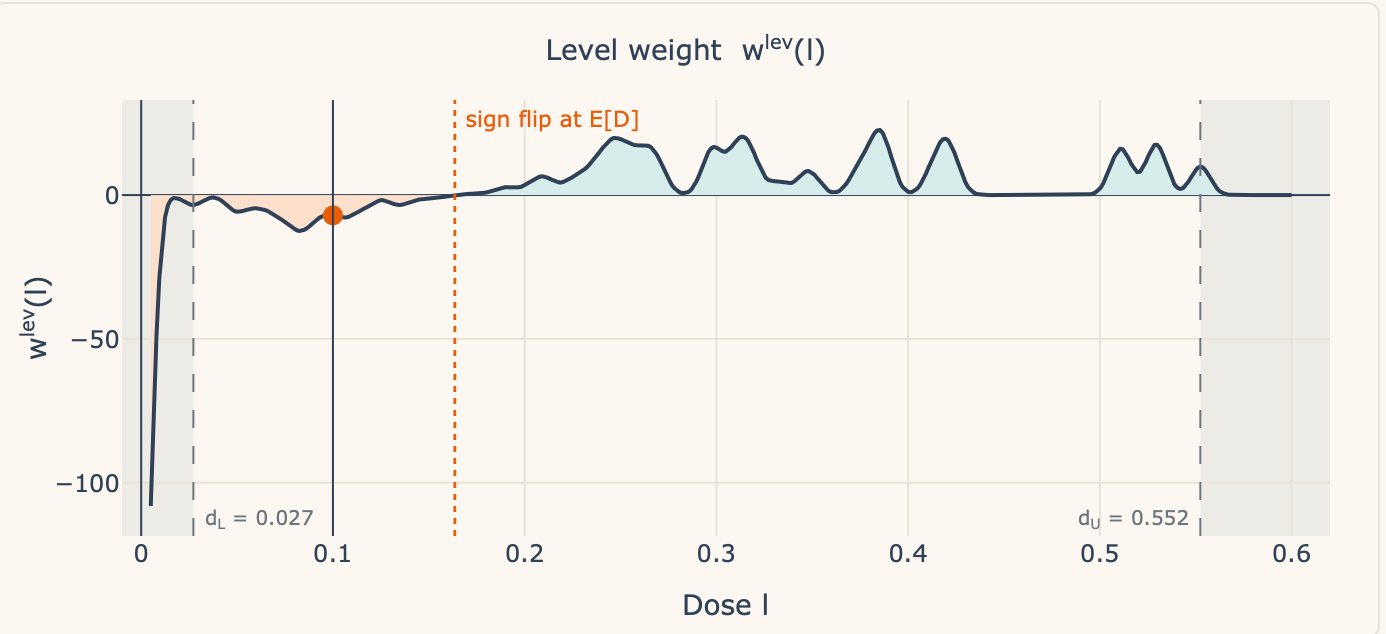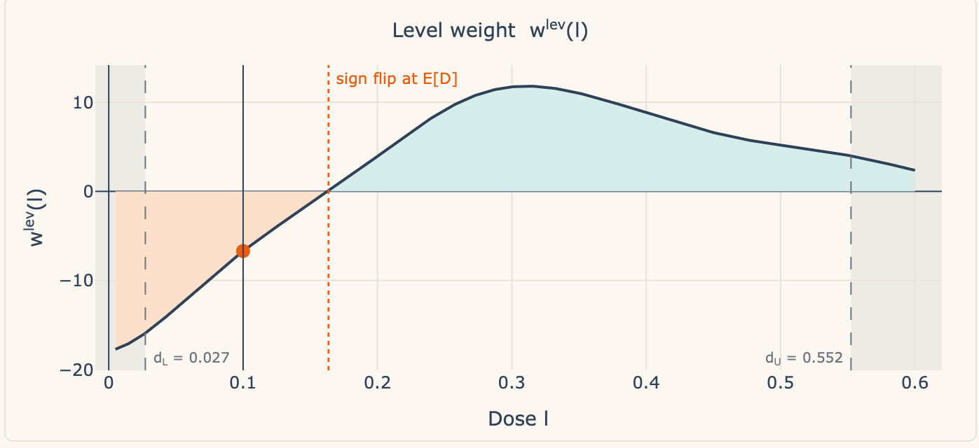 Now essentially the most fascinating factor on this decomposition is the signal flip. Discover what occurs when the dosage is precisely equal to the imply. The imply, recall, is E[D], equalling 0.164: