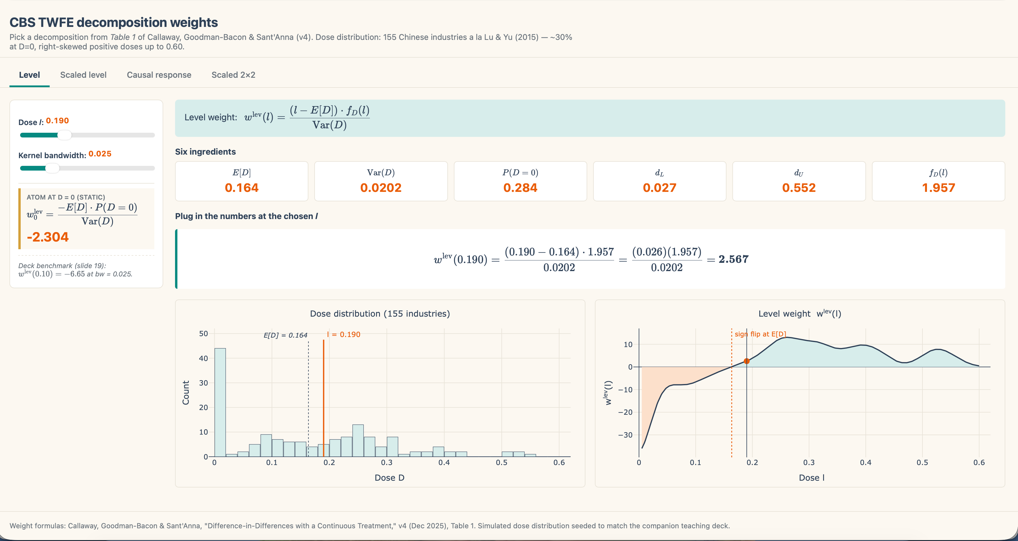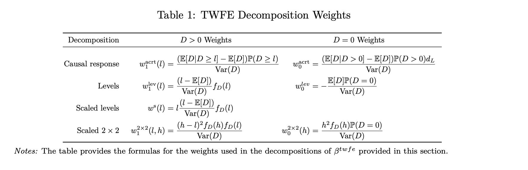 (beta^{textual content{twfe}} ;=; int_{d_L}^{d_U} underbrace{frac{(l – E[D]) cdot f_D(l)}{textual content{Var}(D)}}_{w^{textual content{lev}}(l)} cdot [m(l) – m(0)], dl)