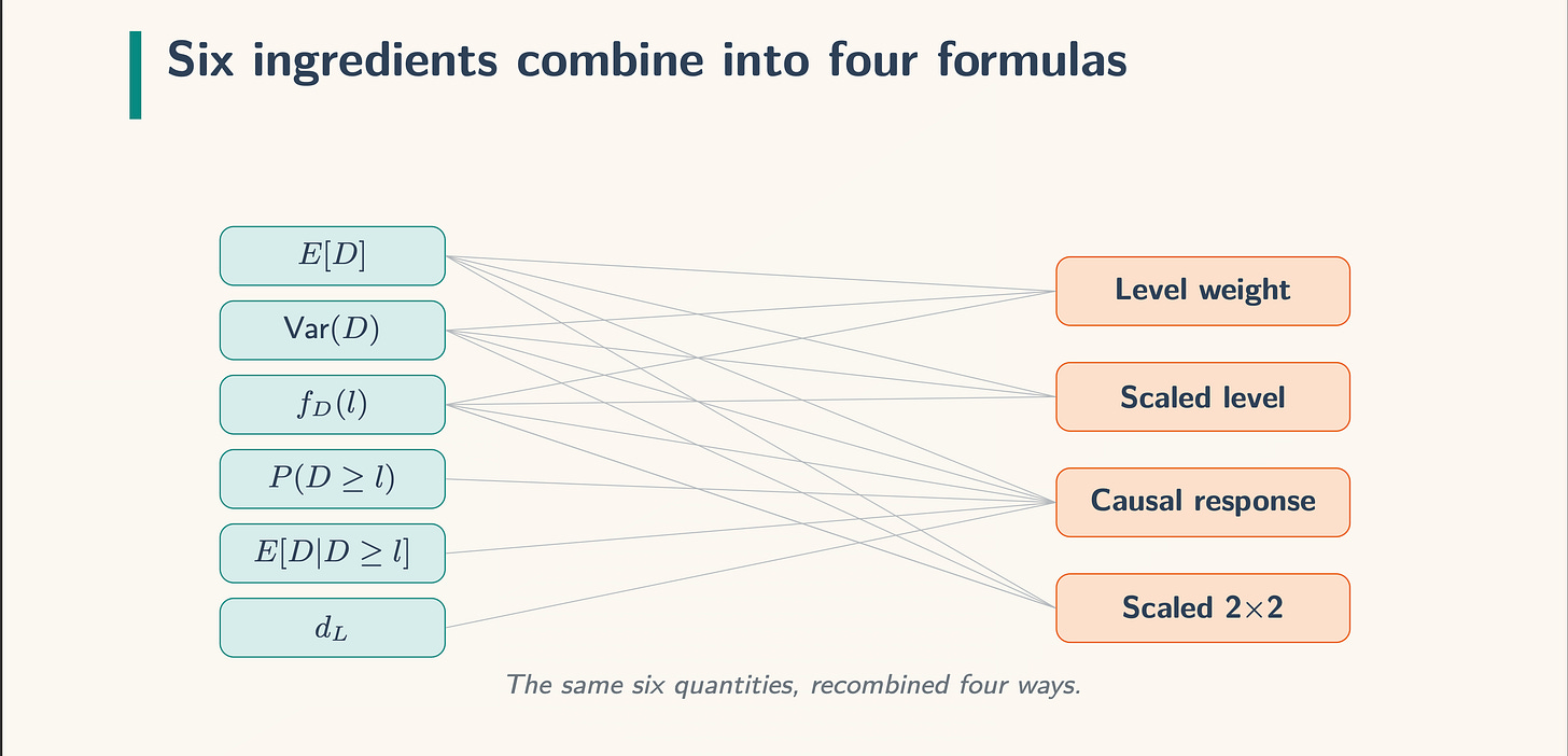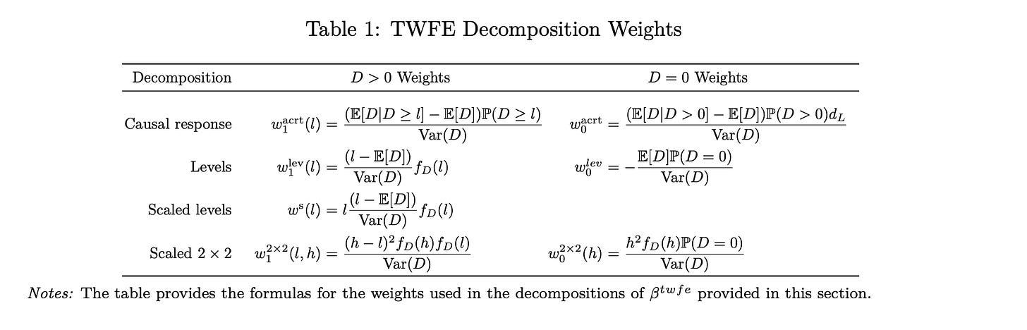 The issues on the left are the load components and the issues on the correct are the actual decomposition. So we’re doing degree weight, and subsequently we now have three components to it: the imply of the remedy dosage within the knowledge (E[D]), the variance, and the density. We combine over the doses utilizing the density formulation. Keep in mind our TWFE formulation from earlier: