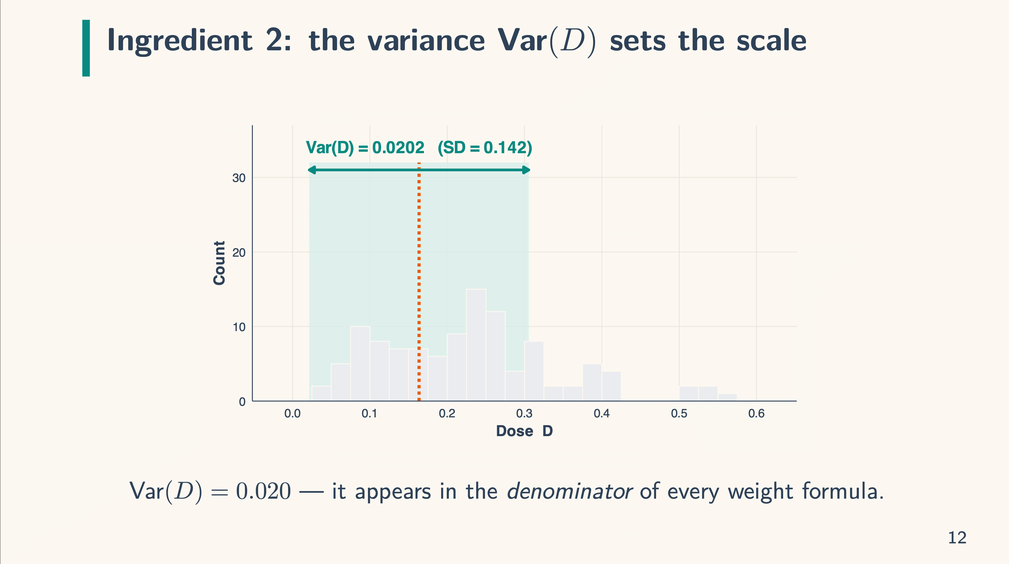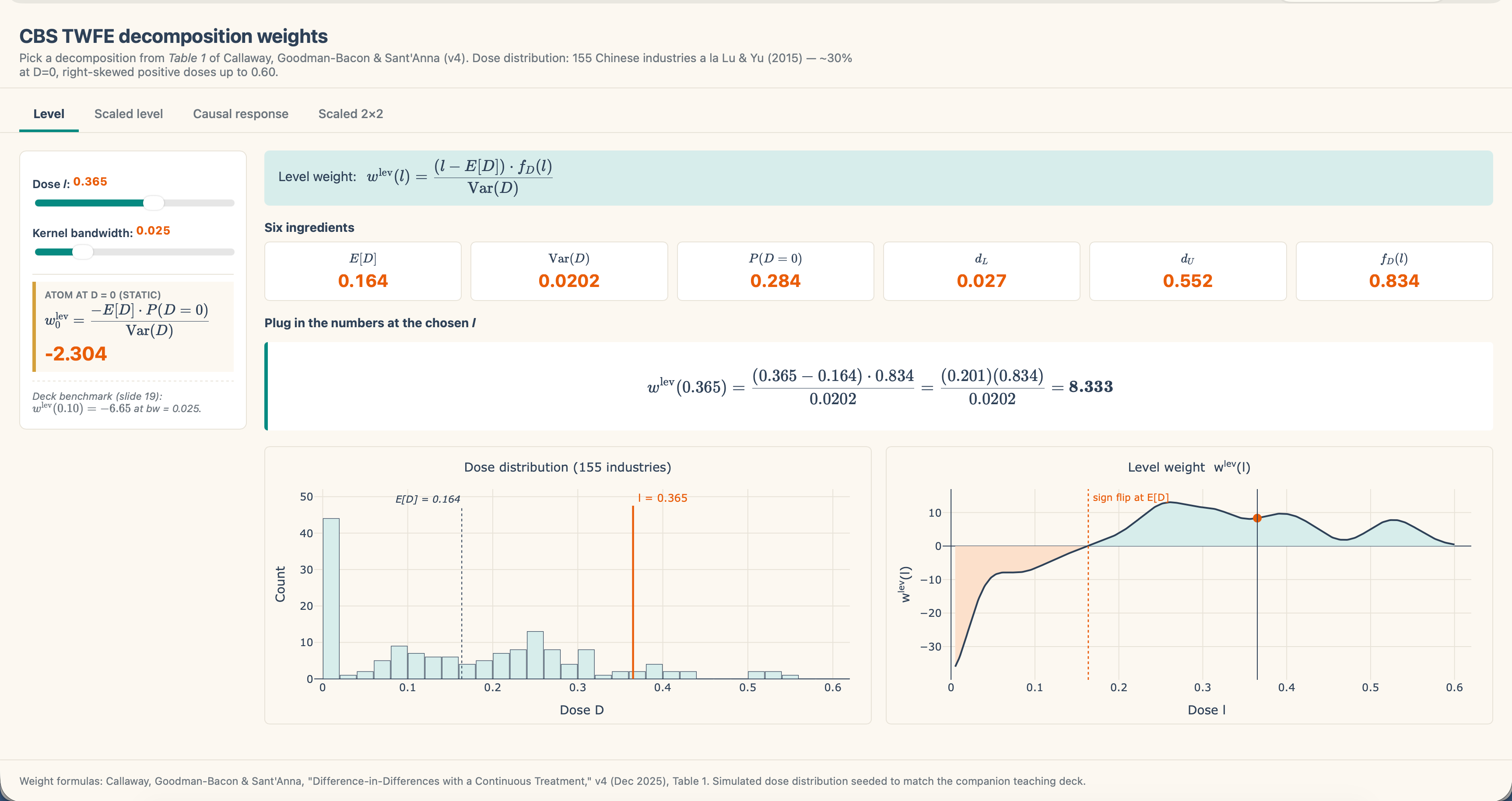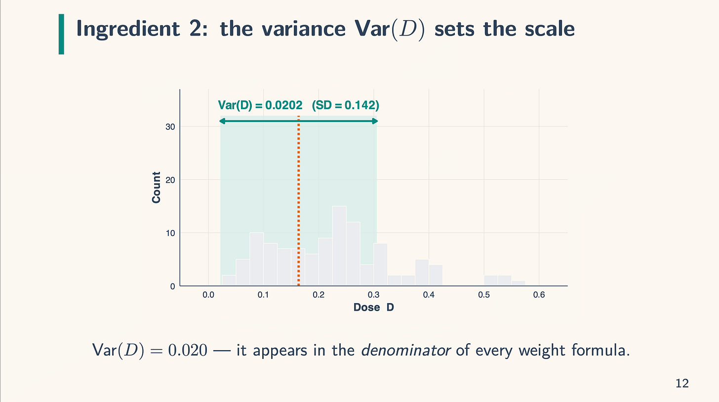 So, when you could have a unit or set of models whose dose is precisely the imply, then the load on them curiously is zero. Now in our case, as a result of the remedy is a steady dose for which the likelihood of any actual worth is zero, I don’t present the load at that degree as there isn’t a one with precisely the imply dose. However, you’ll be able to see what occurs if you happen to transfer the slider left and proper — when industries have an above common dose, they’re positively weighted, however once they have a under common dose, they’re negatively weighted. For example this, I filmed myself a second time.