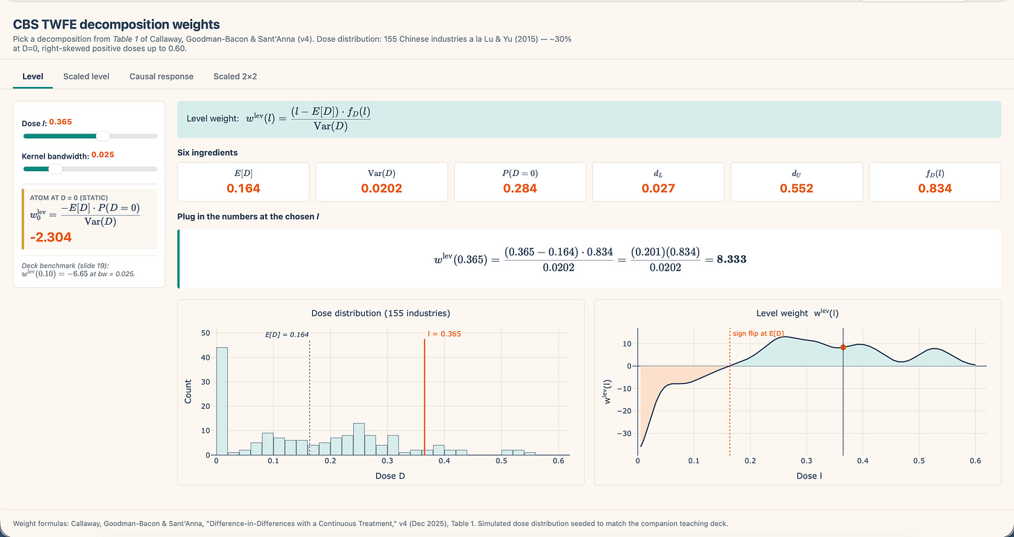 And so with all that out of the best way, I’ll transfer on to the subsequent merchandise on my agenda which is to make use of Claude Code to create a shiny app that helps all of us higher perceive simply what’s going on in that formulation. I’ve a stroll by of that right here in a 35 minute video, which resulted on this shiny app that you need to use now that will help you higher perceive the TWFE decomposition and the whereabouts of unfavourable weights that it makes use of to calculate its coefficients. That is my first shiny app, and technically Claude Code made it so it isn’t even my shiny app, however I assumed it was enjoyable. I’m internet hosting it on my web site.