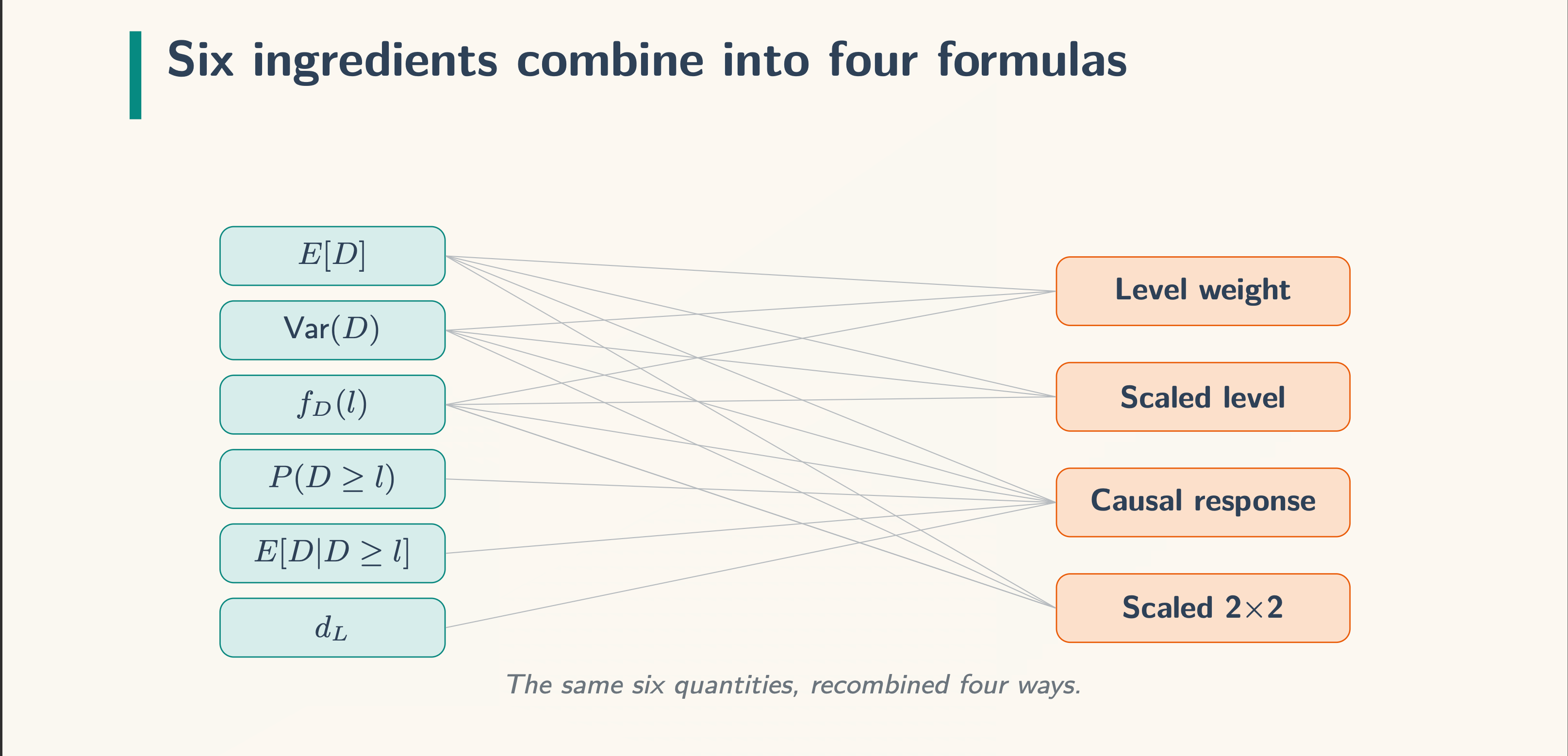 Again to the components. Right here’s the primary one: the imply, E[D]: