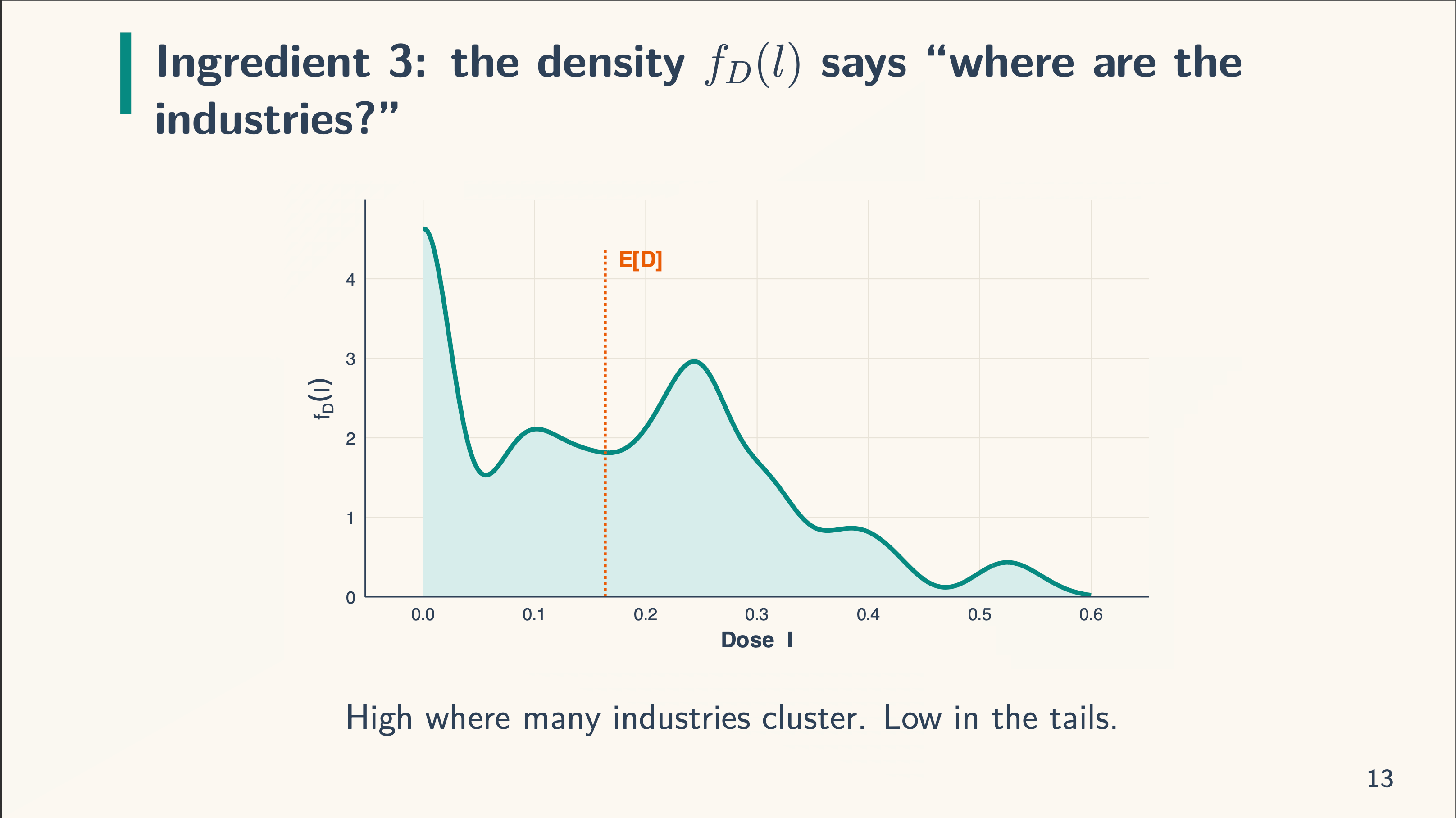 After which there may be the density, f_D(l). That is what we will probably be integrating over. The dosage is introduced as steady, but when it was multi-valued, we’d simply take weighted averages. When the density is excessive, there are various models with that worth and when it’s low, there are few. The truth that it’s excessive at zero within the picture under implies that there are a lot of models with zero dose. After we work with the density formulation, we calculate the density at a given dose, l. So if the dose was l=0.10, we simply calculate the density related to it.