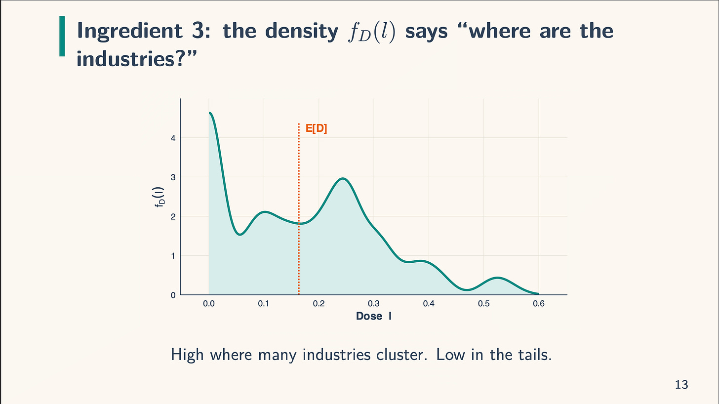 Anyway, the TWFE estimator integrates from the smallest to highest doses, and when industries have doses under the imply, we’re in that zone to the left in that sort of orange hue-ish trying vary, all of that are unfavourable weights, and when the dose is above the imply, we’re above zero in that turquoise blue and that’s constructive weights.