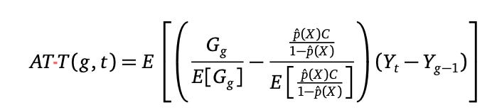 It’s a simple estimator in some ways. In contrast to two-way fastened results, the place the entire knowledge is processed as soon as utilizing matrix calculations to resolve for a single coefficient, CS as its typically known as estimates smaller constructing block coefficients, one after the other, after which takes weighted averages of them when you’ve accomplished doing them. These coefficients are known as 2x2s and when assumptions maintain they map onto one thing known as the group-time ATT, or ATT(g,t). The ATT(g,t) is a inhabitants estimand, as they are saying, which in a sampling framework means for those who had all the info, you’d calculate it like this: