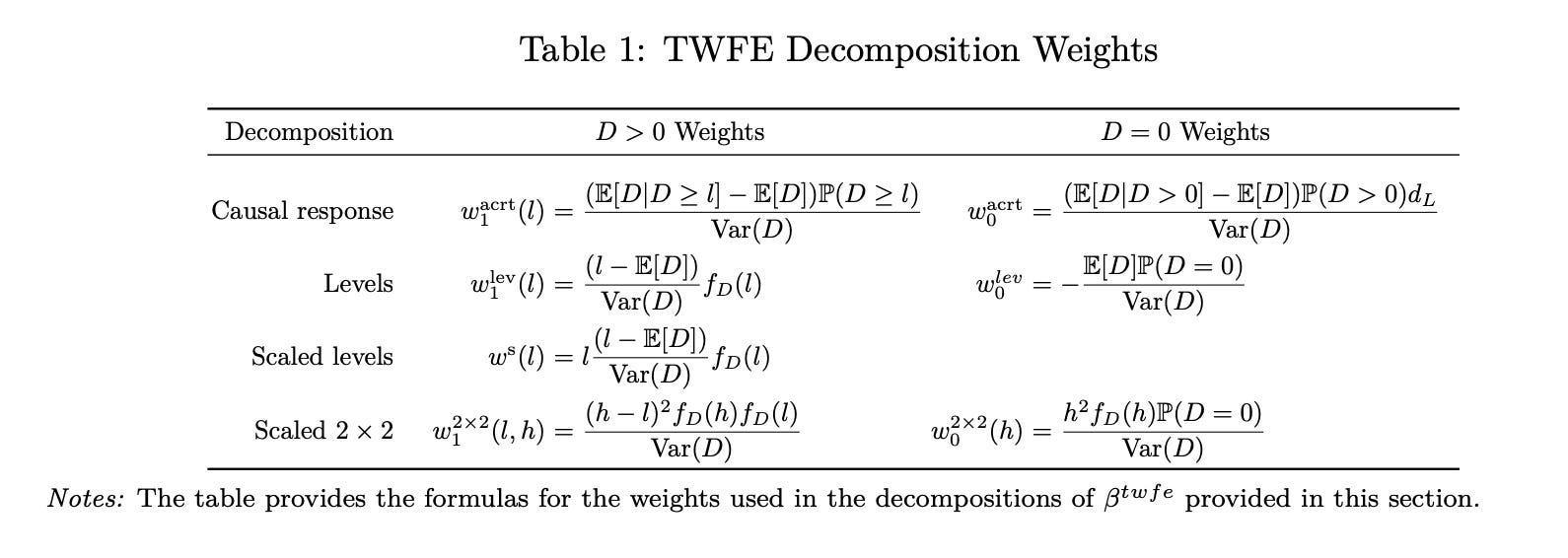 There’ll solely be one coefficient. We conventionally name it β-hat. And utilizing FWL, we are able to decompose it algebraically right into a set of weights consisting of a density perform (f_D(l)), deviations from the imply (l-E[D]) and variance (Var(D)). These three issues are the constructing blocks of the “Ranges” row. You may have these three, you possibly can all the time calculate the β-hat from TWFE with out ever technically operating the regression as a result of FWL allows you to calculate algebraically the regression coefficient with out really operating the regression.