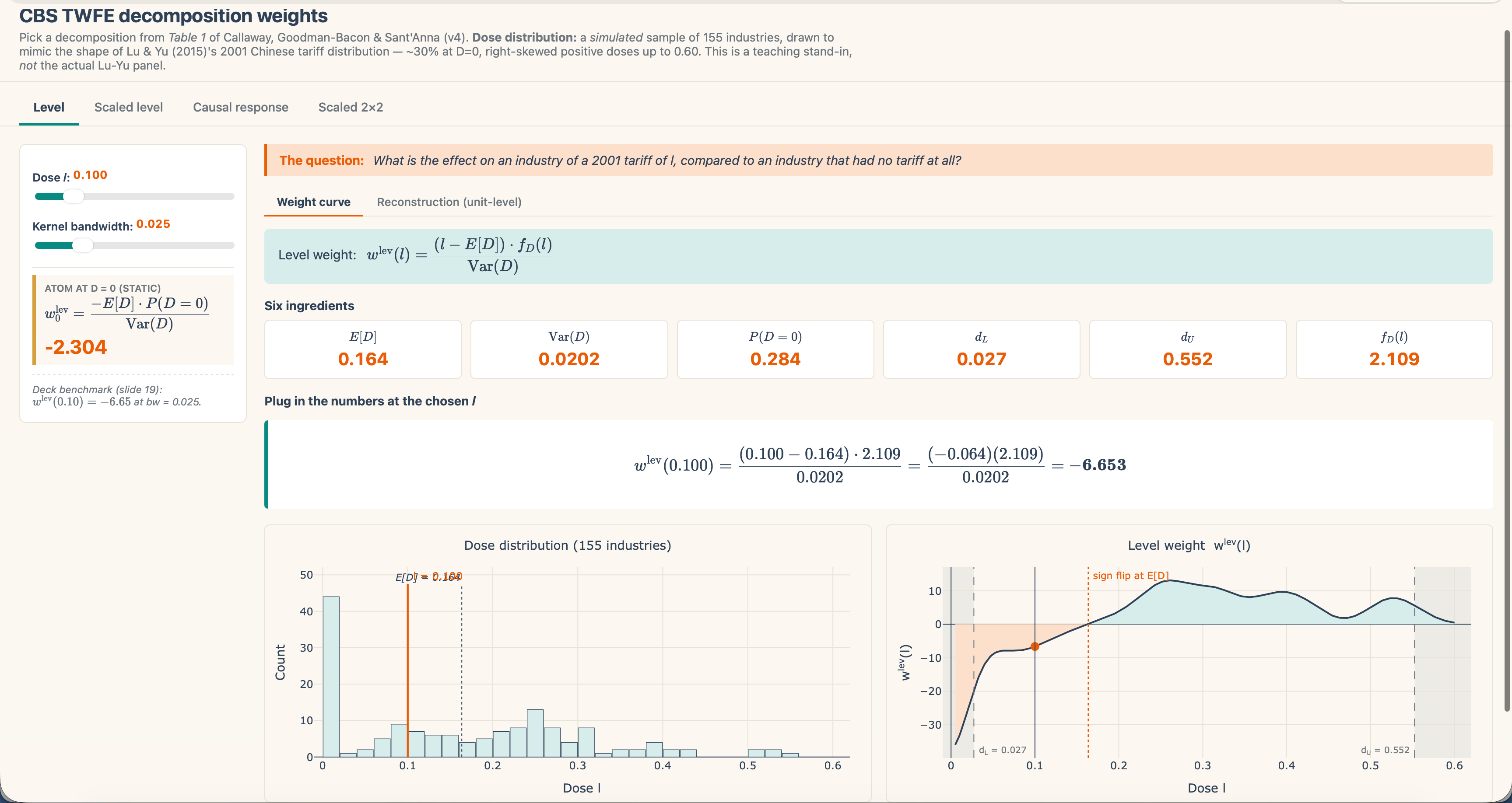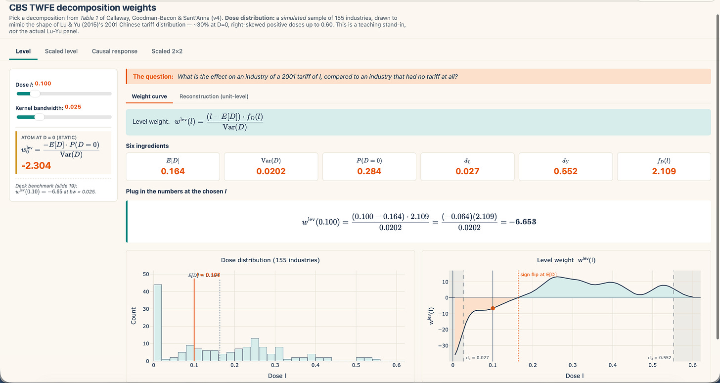 For an business that confronted a 15 proportion level tariff in 2001, what’s the impact of that tariff on their consequence, in comparison with an business that confronted no tariff in any respect? This can be a degree impact. That is the one I’ve been working with the previous couple of substacks. That is the one which yow will discover underneath the first tab of my shiny. It’s a distinction between handled at dose l and untreated. Desk 1’s second row labeled the “ranges decomposition,” rewrites β-hat as a weighted common over degree results of this type.