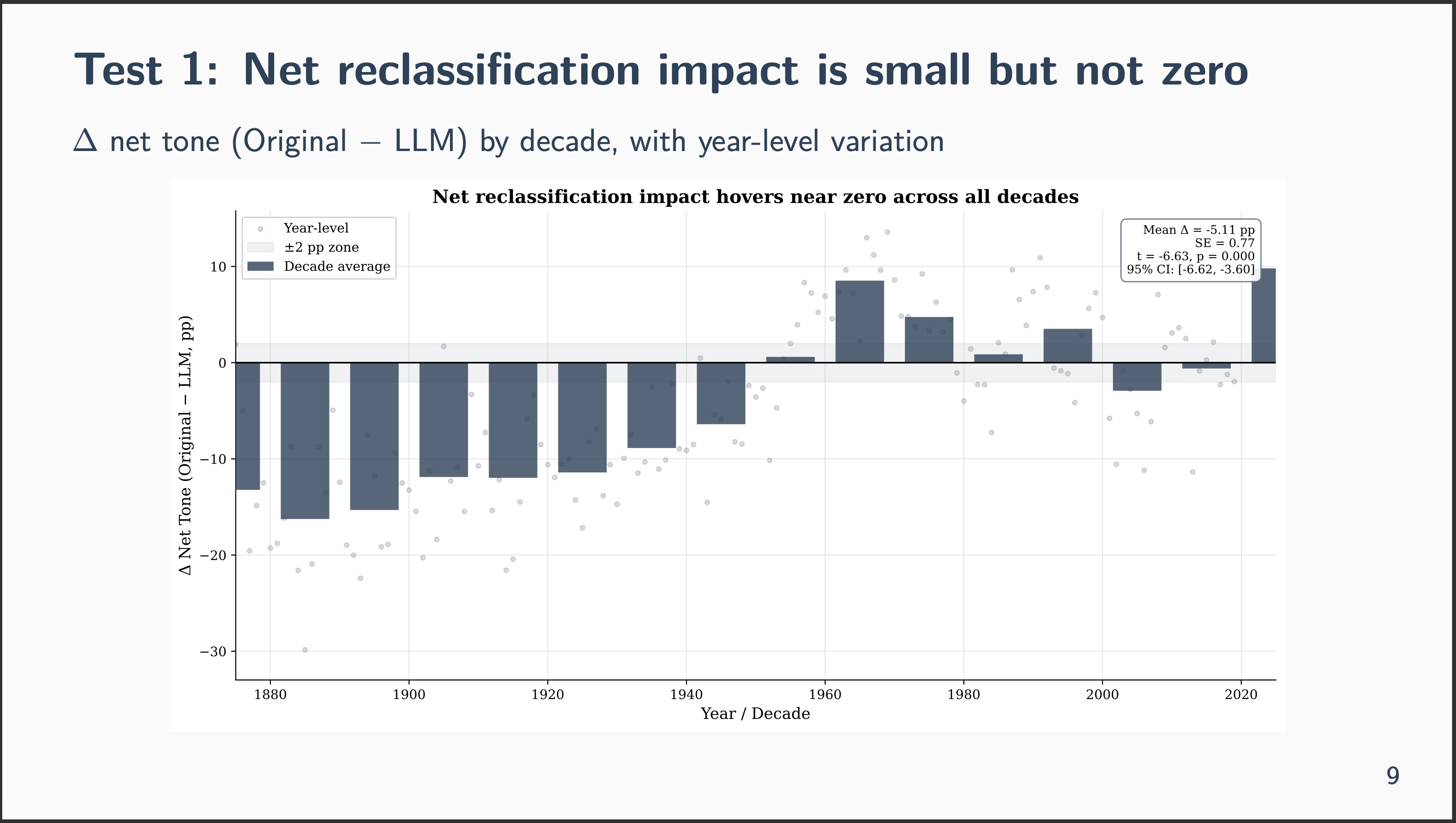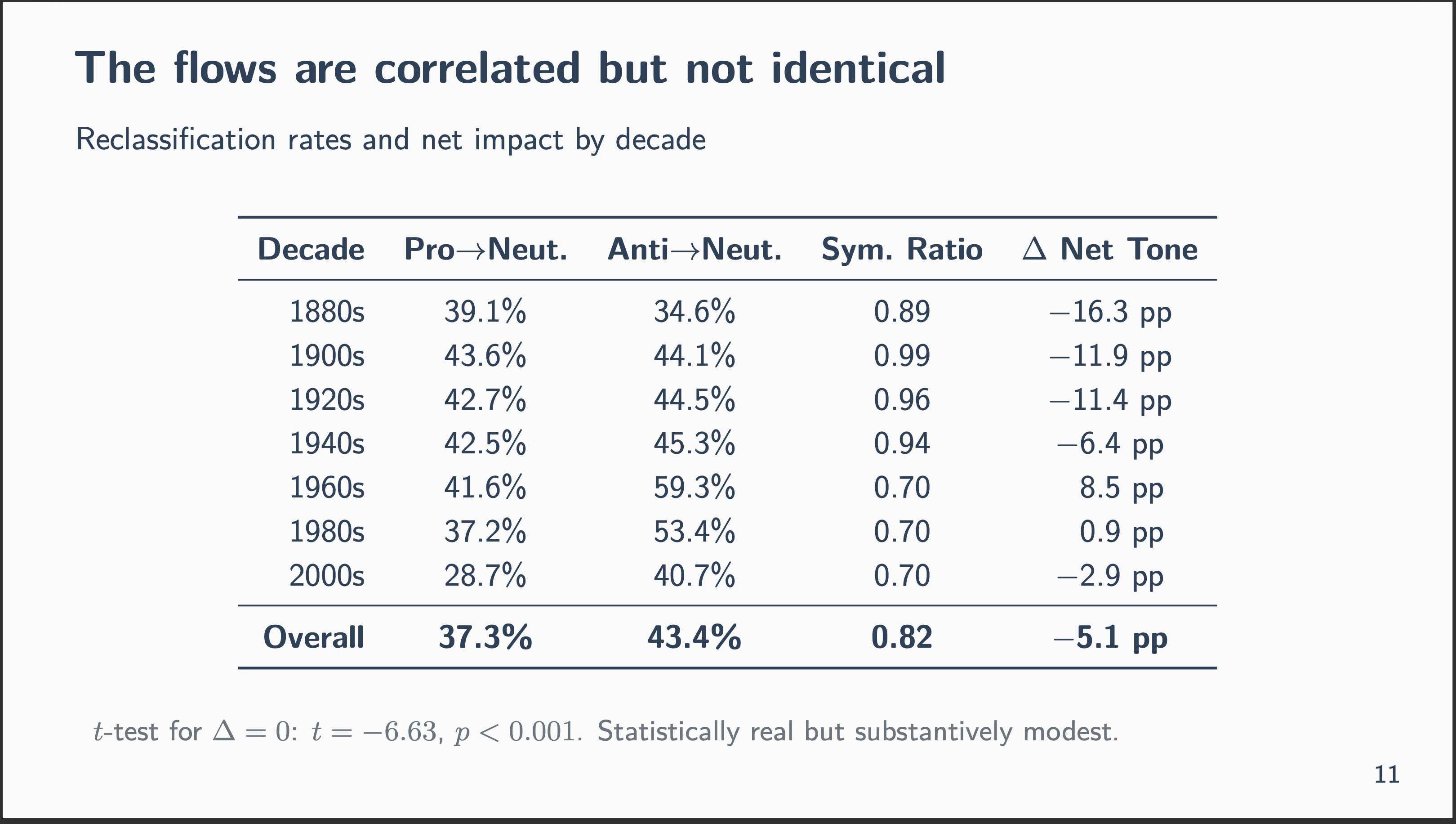 Right here’s the speculation I stored coming again to. The important thing measure in Card et al. is web tone — the share of pro-immigration speeches minus the share of anti-immigration speeches. It’s a distinction. And when the LLM reclassifies, it’s overwhelmingly pulling speeches towards impartial from either side. 33% of Professional goes to Impartial. 44% of Anti goes to Impartial. Direct flips between Professional and Anti are uncommon — solely about 4-5%.