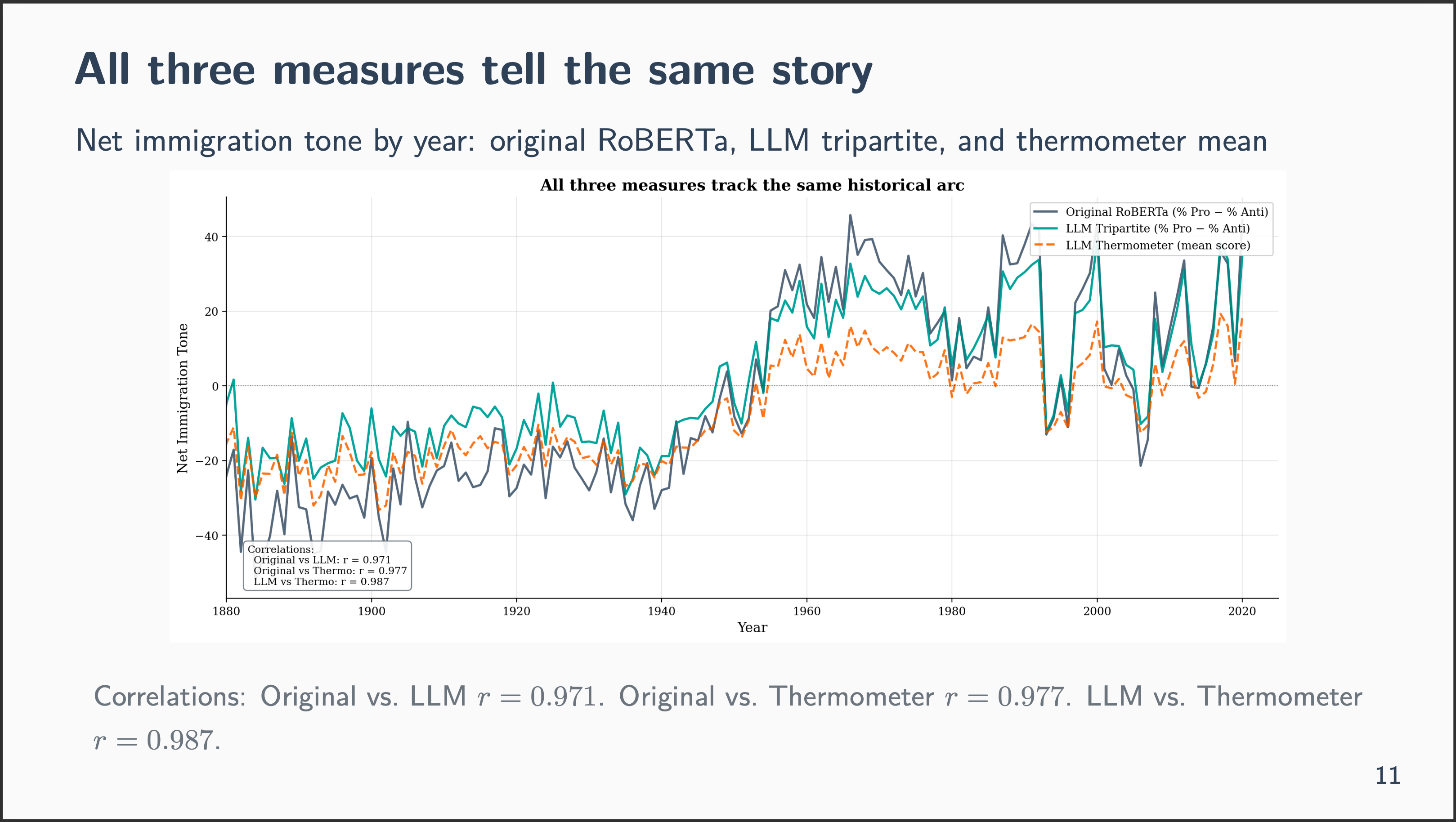 As soon as the outcomes got here again, we merged three datasets: the unique RoBERTa labels, the LLM tripartite labels, and the brand new thermometer scores. Then we examined the speculation 3 ways.