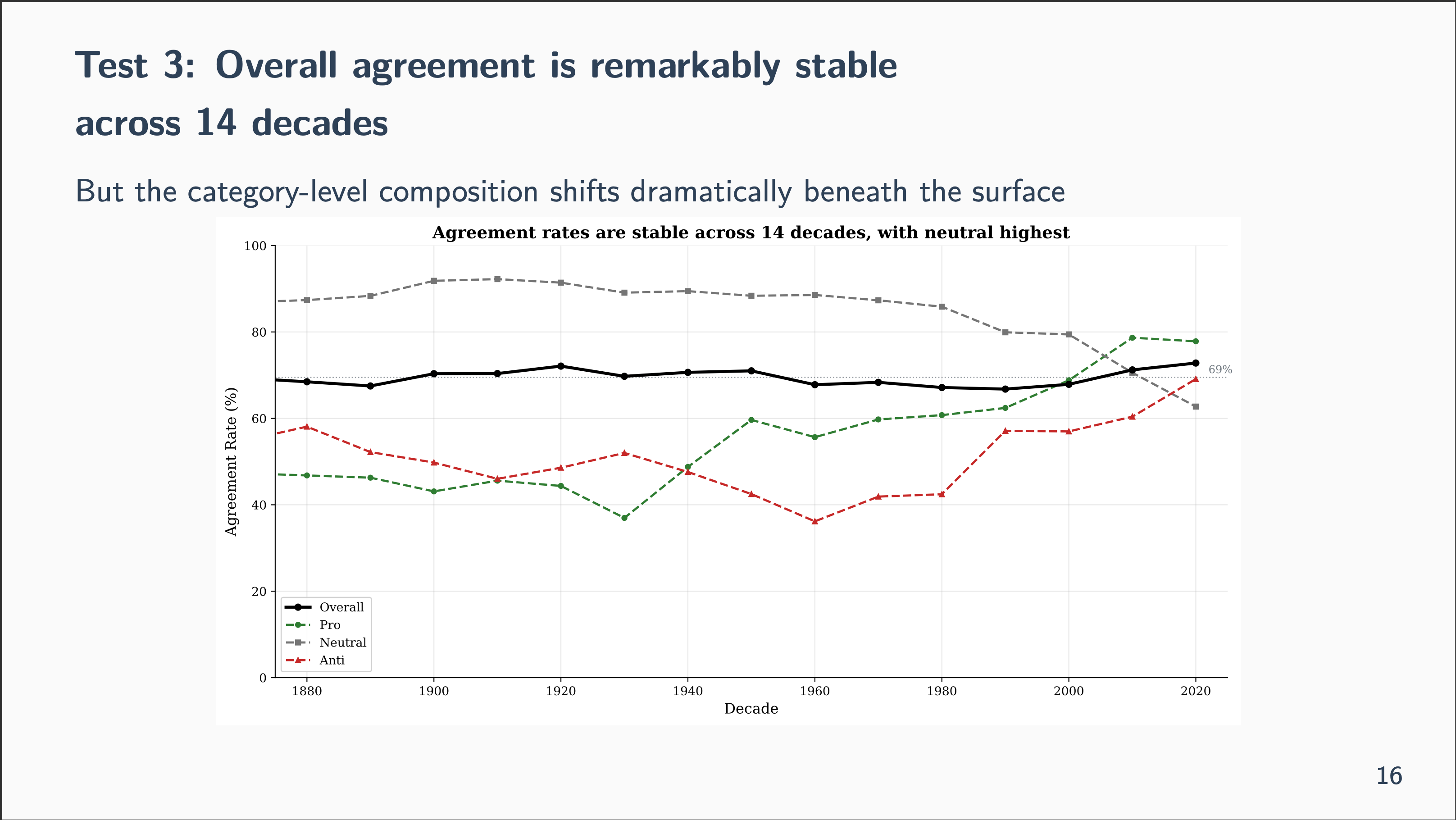 We constructed two exams. The shock: total settlement barely strikes. It’s 70% within the Eighties and 69% within the fashionable period. The LLM handles Nineteenth-century speech about in addition to Twenty first-century speech.