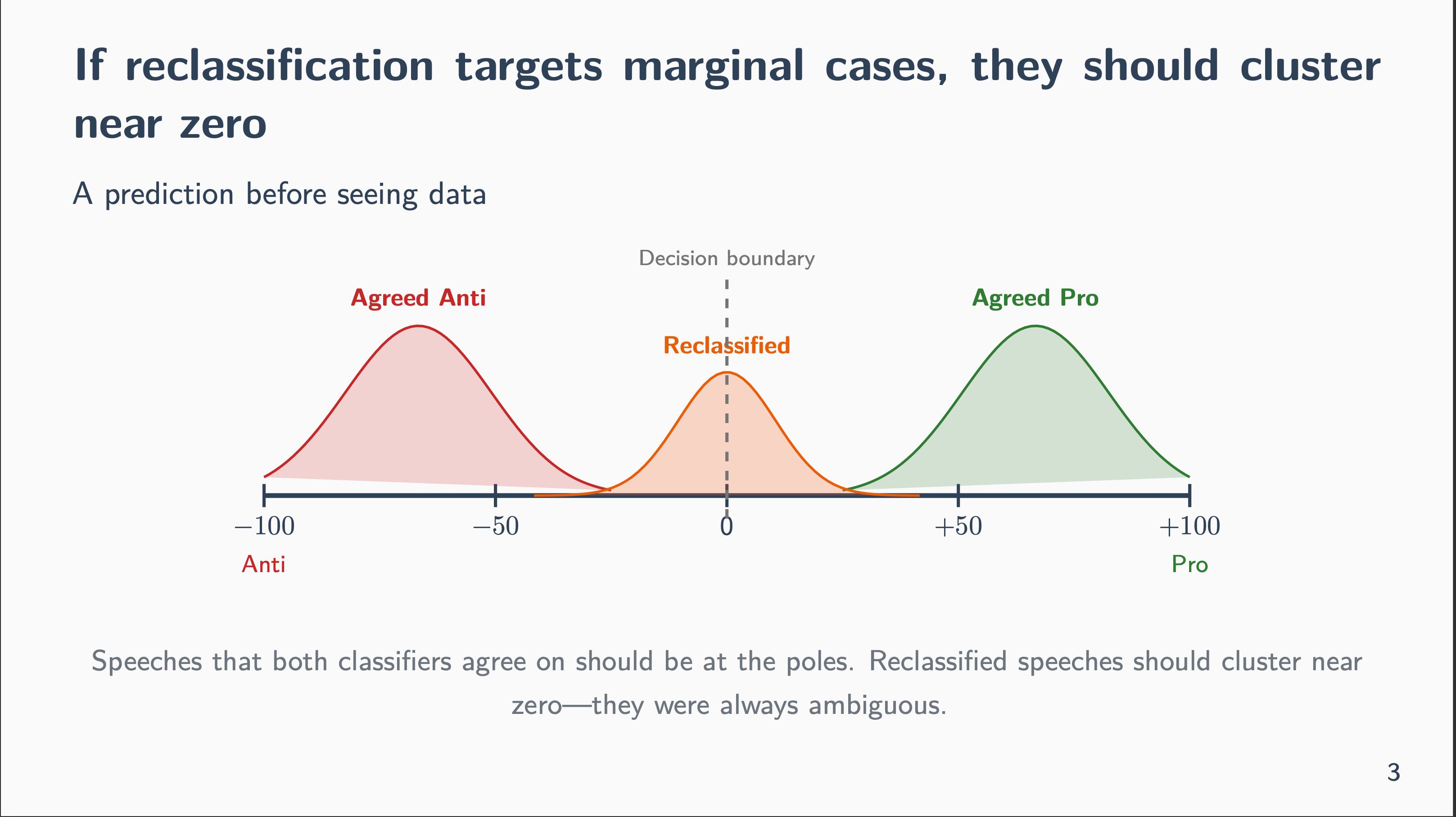 The prediction: if reclassification is admittedly about marginal circumstances, the speeches that bought reclassified ought to cluster close to zero. They had been all the time borderline. The LLM simply known as them in a different way.
