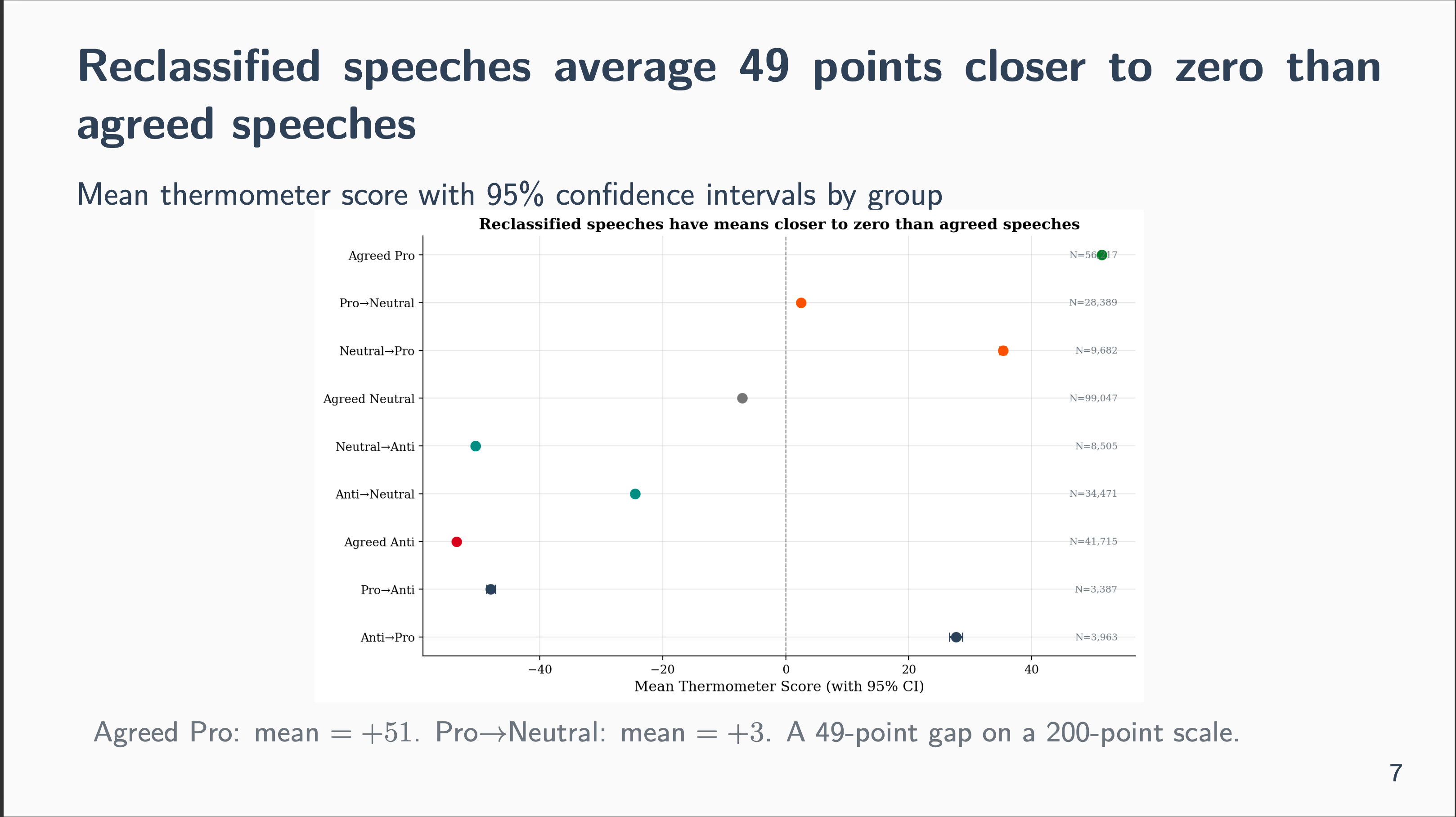 First, the distributions. We plotted thermometer scores individually for speeches the place the classifiers agreed versus speeches that bought reclassified. The reclassified Professional-to-Impartial speeches cluster close to zero from the fitting. The reclassified Anti-to-Impartial speeches cluster close to zero from the left. The speeches the place each classifiers agreed sit additional out towards the poles. Precisely what the speculation predicts.