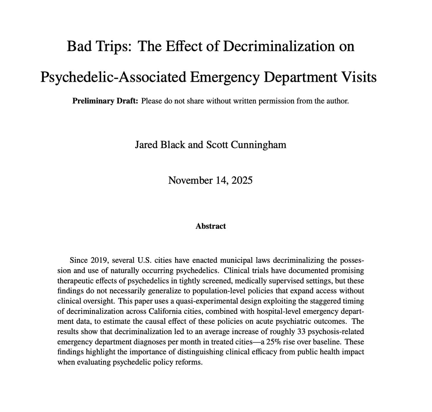On a special observe, I’m going to be presenting a brand new paper at Brandeis College (thanks Dan and Tymon!) subsequent week. That is primarily based on analysis that my former pupil, Jared Black, did for his dissertation in Baylor’s well being companies analysis PhD program (for which I would be the PhD coordinator after my depart of absence concludes within the spring of 2026). This paper is in regards to the decriminalization of “psychedelic crops” (e.g., fungi, cacti, bark) in California municipalities beginning in 2019. This has been a ardour venture of mine for years, and I’m excited that this work is lastly shifting into manuscript type.
